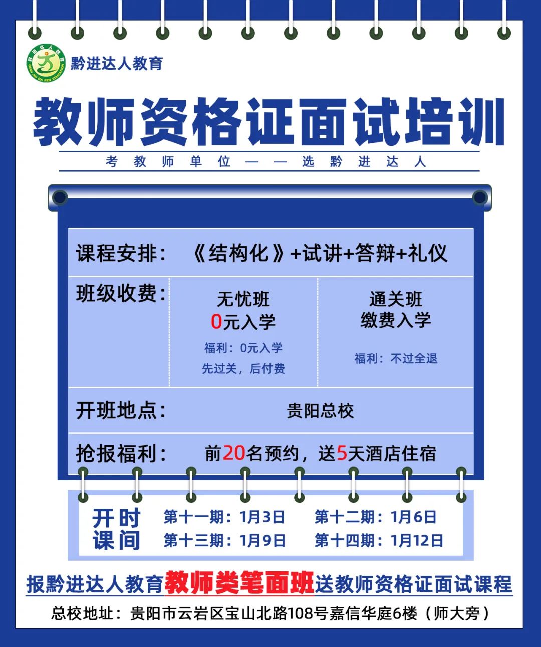 教师资格证面试培训正在开课中;下一期将于1月3日开课,报黔进达人教师类笔面班送教师资格证面试课程。