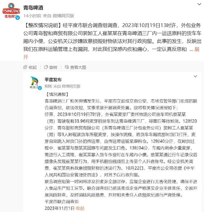 昨日晚间,青岛啤酒公告,经平度市联合调查组调查,2023年10月19日13时许,外包业务公司青岛智和商贸有限公司装卸工人崔某某在青岛啤酒三厂内一运送原料的货车车厢内小便,公安机关以涉嫌故意损毁财物依法对其行政拘留。此事的发生,反映出公司在原料运输管理上有漏洞,对此深感内疚和痛心,一定认真反思和整改。在此,向广大消费者表示真诚的歉意!