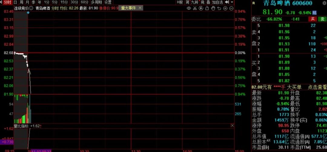 11月2日,青岛啤酒开盘跌0.46%,盘中继续下挫,截至发稿,跌幅扩大至近1%。