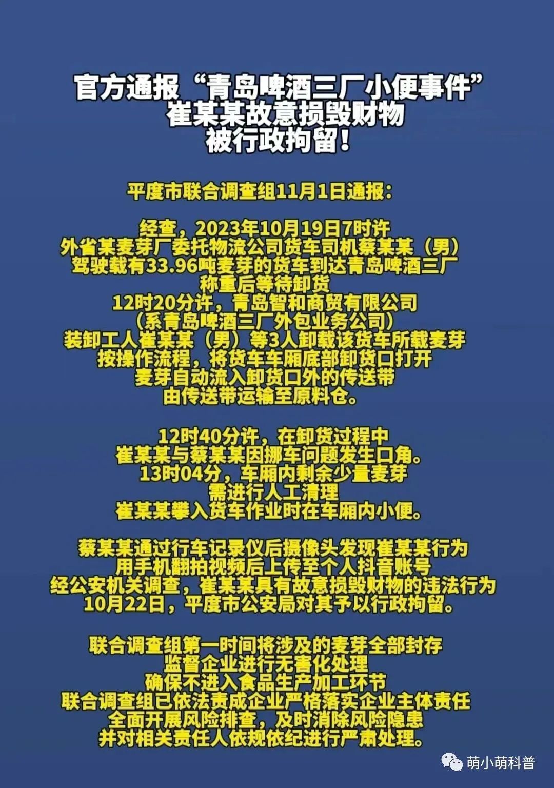 青岛啤酒小便事件的官方通报来了,真相终于水落石出了。简单来说,就是装卸工和卡车司机因为搬运问题发生争吵后,装卸工在麦芽车厢小便。不是原材料仓库,卡车司机拍视频上传到网上。