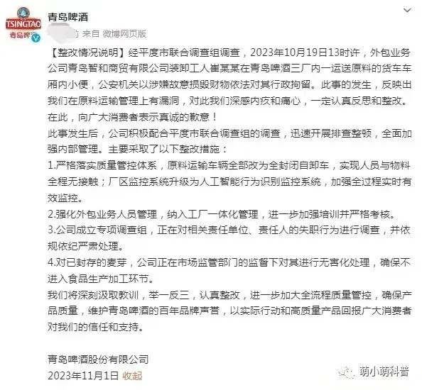 想象一下,如果司机没有发现和曝光这种行为,被污染的麦芽进入原材料仓库,后果是不可想象的。因此,在官方通知发布后,青岛啤酒立即向该事件道歉。除了密封麦芽的无害处理外,还调查了相关责任人的失职行为,并按照规定和纪律认真处理。