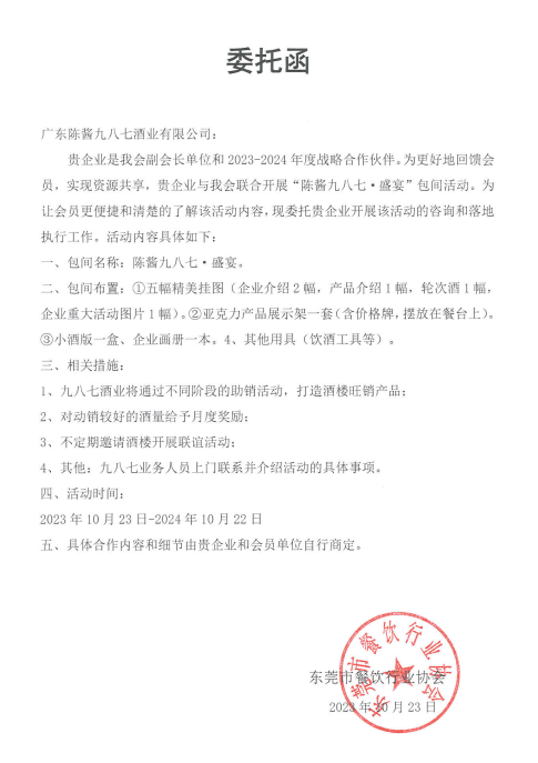 受东莞市餐饮行业协会的委托,为了助力各会员酒楼引流,将九八七系列酱香酒精准推给消费者,打造名菜名酒联盟,呼应“品牌强市·品质东莞”的战略,经我司提议,市餐协研究批准,决定携手九八七酒业在全市餐饮行业会员酒楼打造一批“陈酱九八七·盛宴”精品包间。