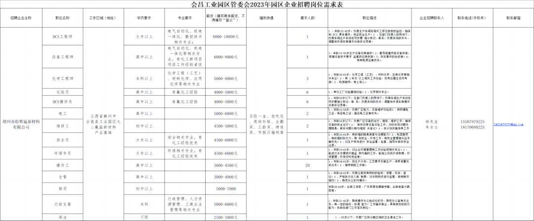 赣州市松辉氟新材料有限公司系深圳市新星轻合金材料股份有限公司 (股票代码:603978 )在会昌投资新建的全资子公司,成立于2022年2月14日,占地250亩左右,新建聚偏氟乙烯等新能源项目。主要生产乙炔、R152a、R142b、VDF、PVDF等产品;本公司生产的二氟乙烷产品质量组分99.99%以上(远超同行业质量组分99.9%的要求,达到同行业全国领先水平),本公司生产的PVDF主要应用在高端芯片刻蚀、新能源锂电池、石油化工容器管道阀门衬氟。依托深圳新星总部研发力量与高校等建立紧密的产学研合作关系,共同进行氟新材料技术研究。目前新星集团拥有博士1人,硕士8人,本科91人,截止目前深圳新星集团已获得260件国内外发明专利;承担了近20项国家省、市、重大科研课题;建立了国家地方联合工程实验室、广东省院士工作站等科研平台。因公司发展,现面向社会高薪诚聘人才。愿您的加入给我们带来新的活力,我们也将为您提供广阔的发展空间!具体招聘岗位及要求详见附件:《会昌工业园区管委会2023年园区企业招聘岗位需求表》。特别优秀者可适当放宽条件。