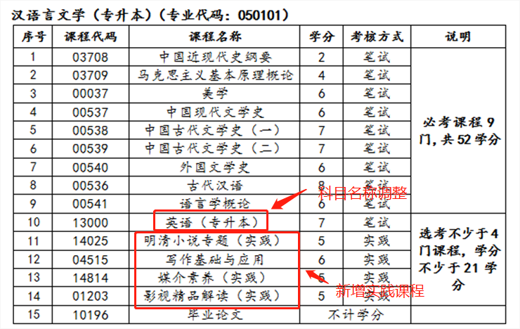 (3)课程设置变化:各专业的课程设置均有不同的调整,较为明显的科目有英语(二)调整为英语(专升本),英语(一)调整为英语(专)。(可参考下方图片)