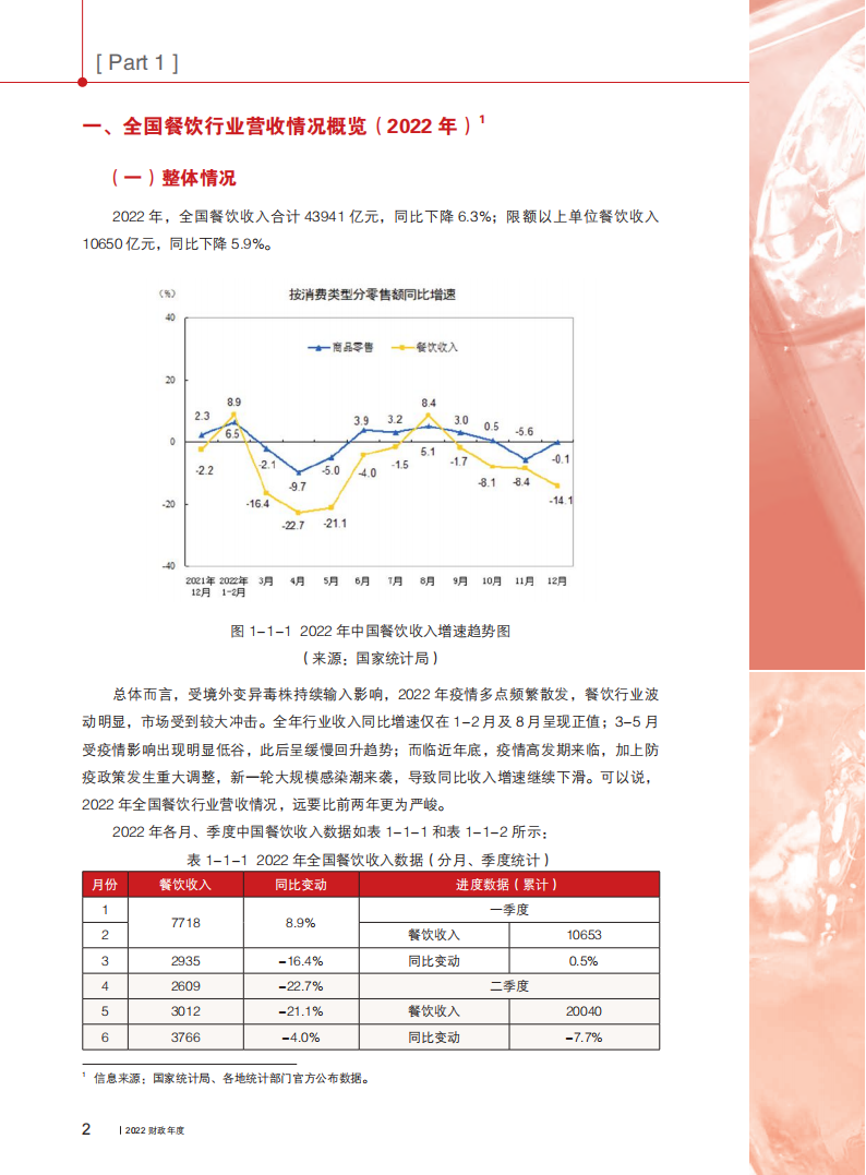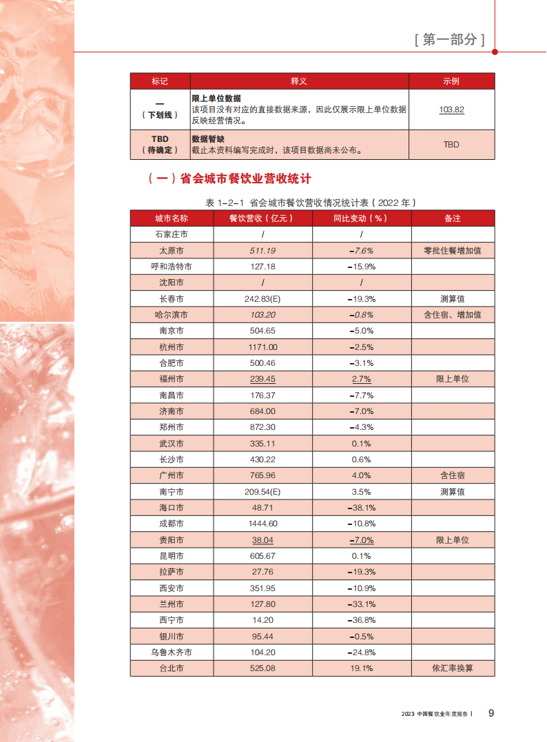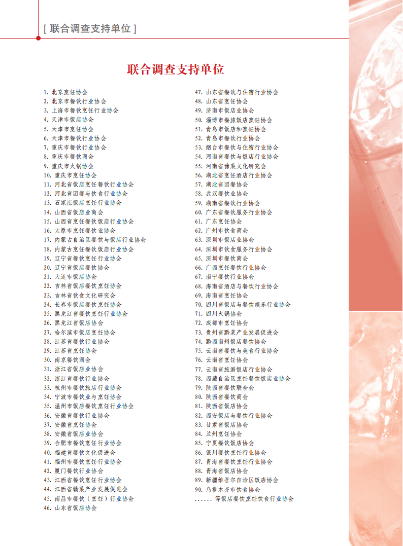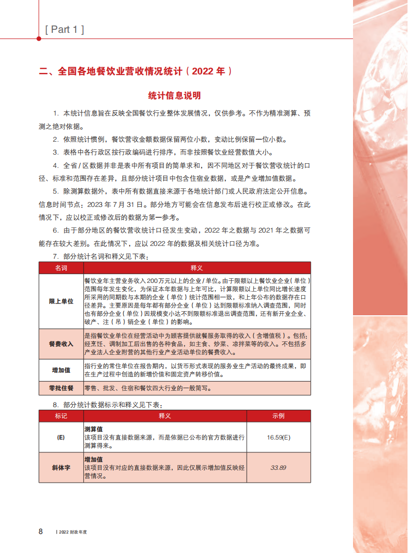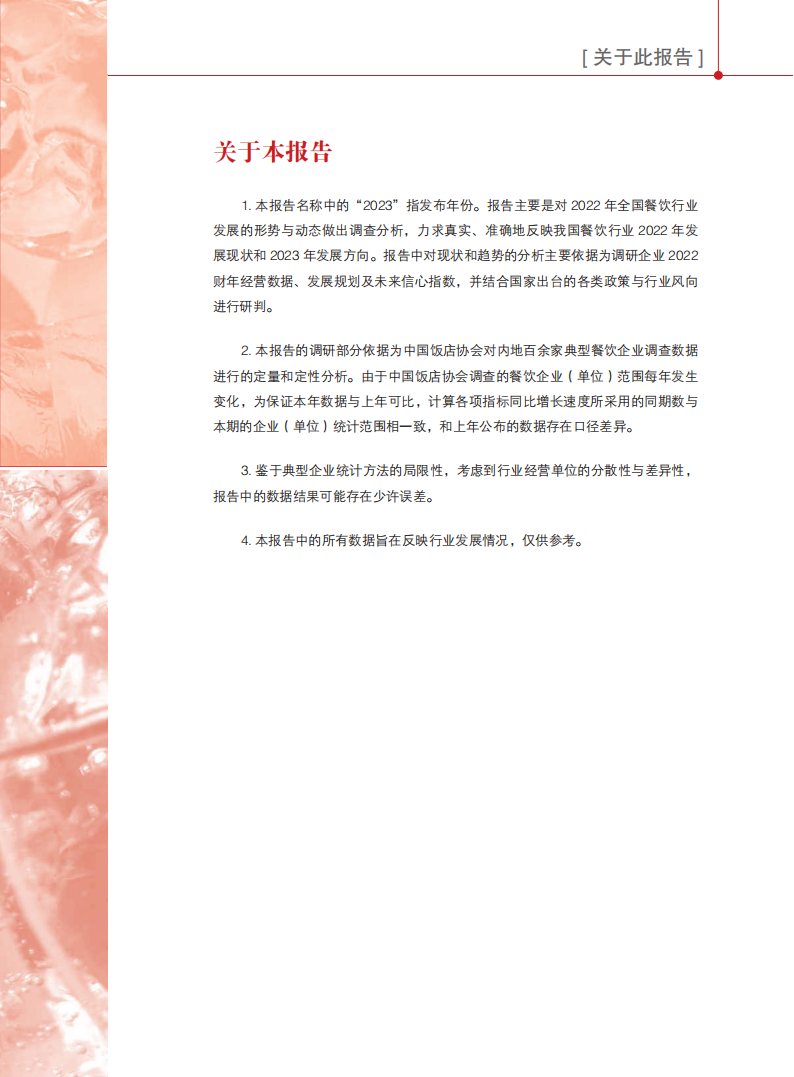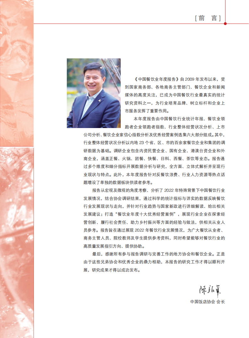 本年度报告由中国餐饮行业统计年报、餐饮业领跑者企业领跑者指数、行业整体经营状况分析、上市公司分析、餐饮企业家信心指数分析及优秀经营案例选集六大部分组成。其中,行业整体经营状况分析以内地 23 个省、区、市的百余家餐饮企业和集团的调研数据为基础。调研企业包含内资民营企业、国有企业、港澳台资企业和外商企业,涵盖正餐、火锅、团餐、快餐、日料、西餐、茶饮等业态。报告通过多个维度和细分指标开展数据分析与研究,全方面、立体式解析并呈现行业现状与特点。此外,本年度报告针对反餐饮浪费、行业人力资源等热点话题增设了单独的数据板块供读者参考。