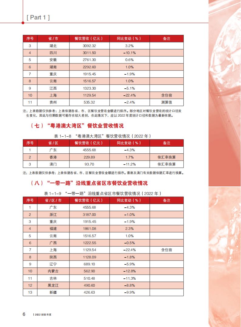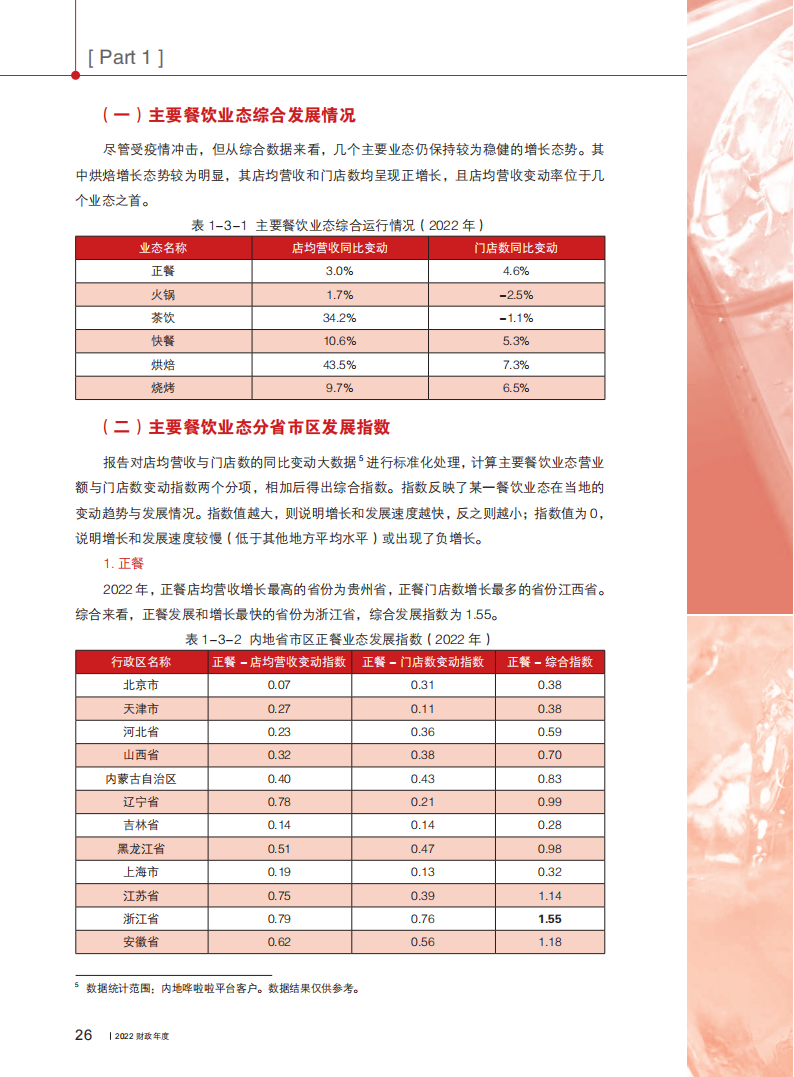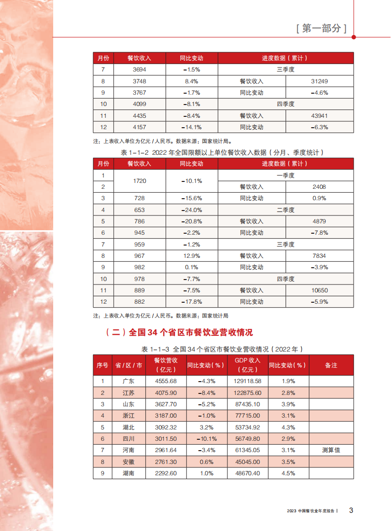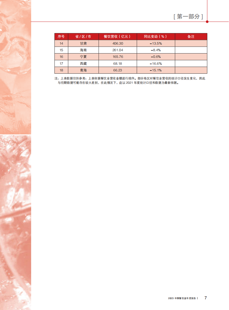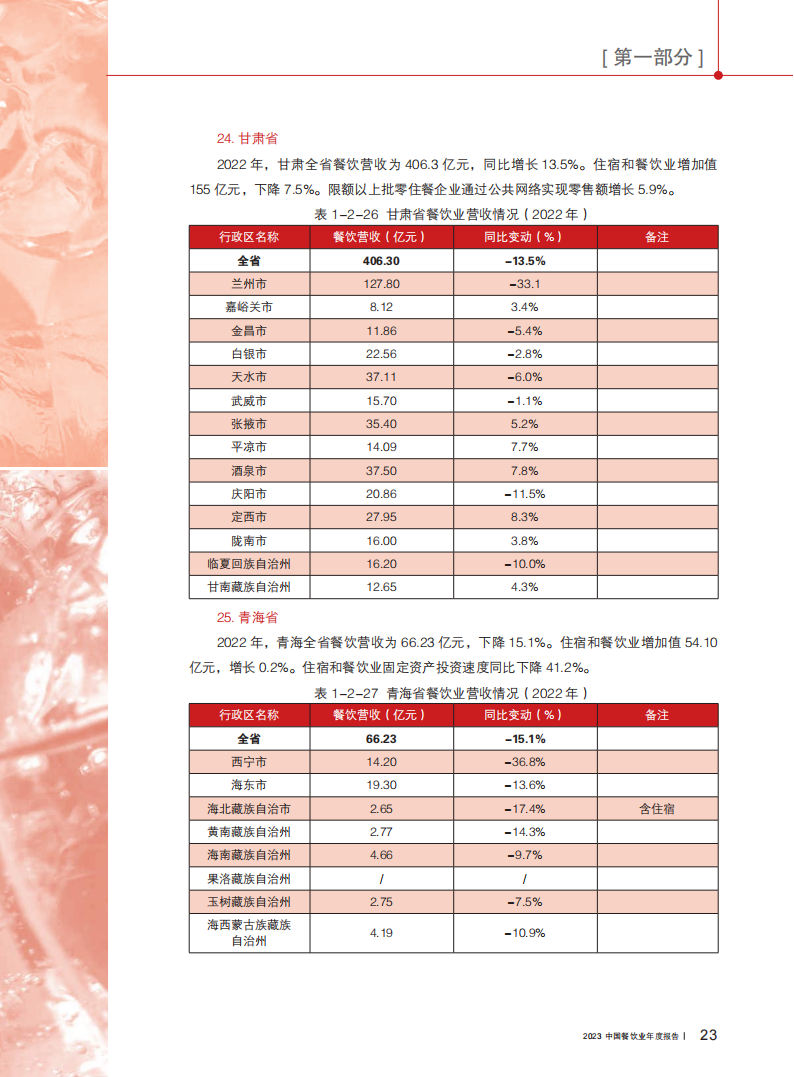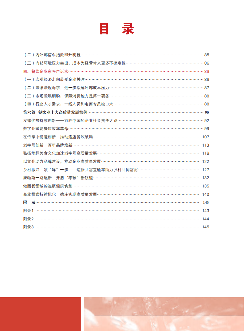 本年度报告由中国餐饮行业统计年报、餐饮业领跑者企业领跑者指数、行业整体经营状况分析、上市公司分析、餐饮企业家信心指数分析及优秀经营案例选集六大部分组成。其中,行业整体经营状况分析以内地 23 个省、区、市的百余家餐饮企业和集团的调研数据为基础。调研企业包含内资民营企业、国有企业、港澳台资企业和外商企业,涵盖正餐、火锅、团餐、快餐、日料、西餐、茶饮等业态。报告通过多个维度和细分指标开展数据分析与研究,全方面、立体式解析并呈现行业现状与特点。此外,本年度报告针对反餐饮浪费、行业人力资源等热点话题增设了单独的数据板块供读者参考。