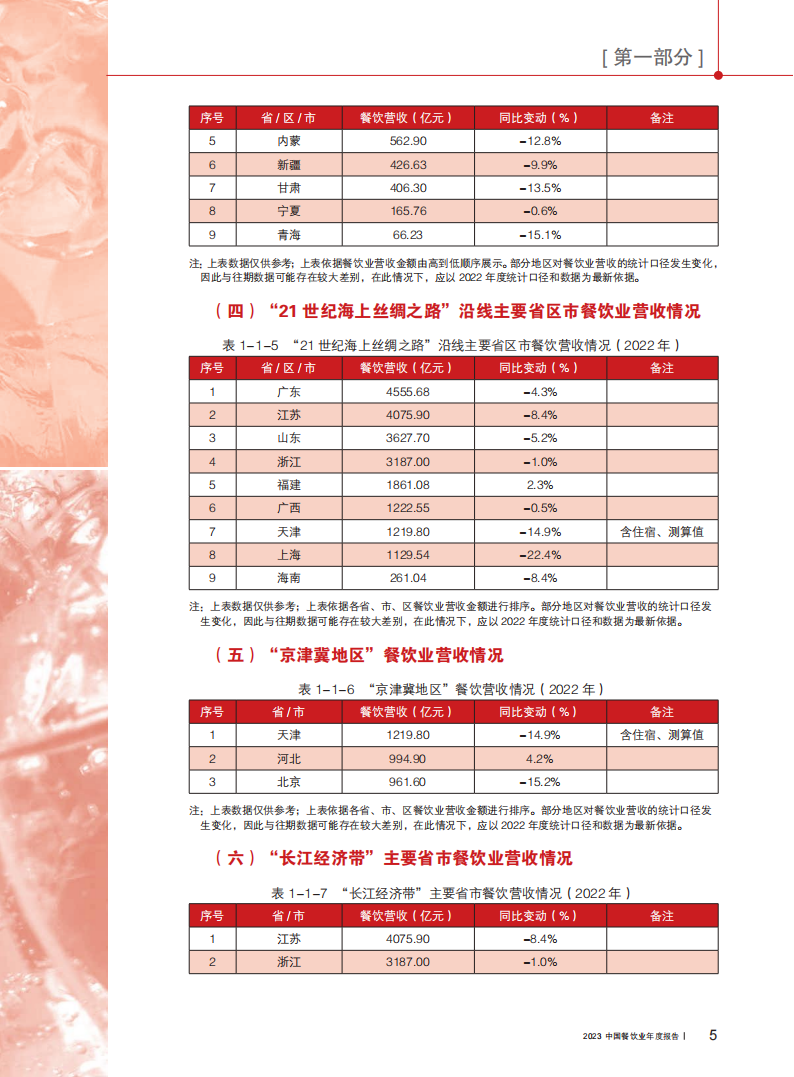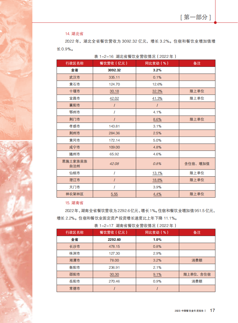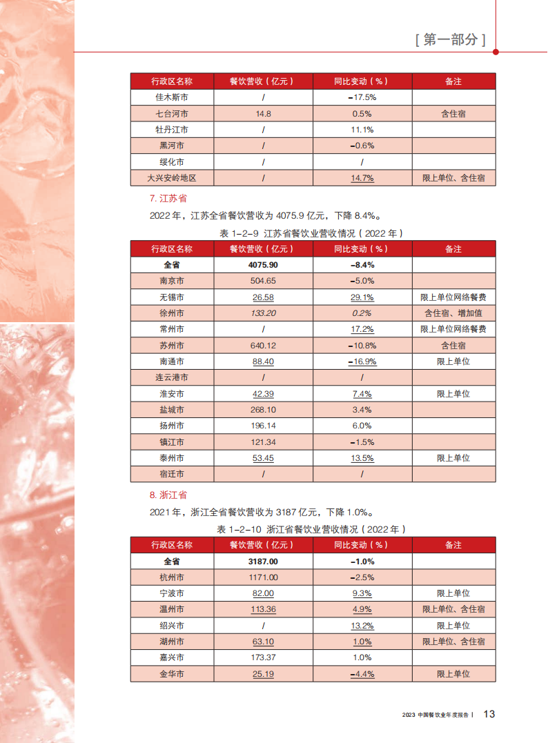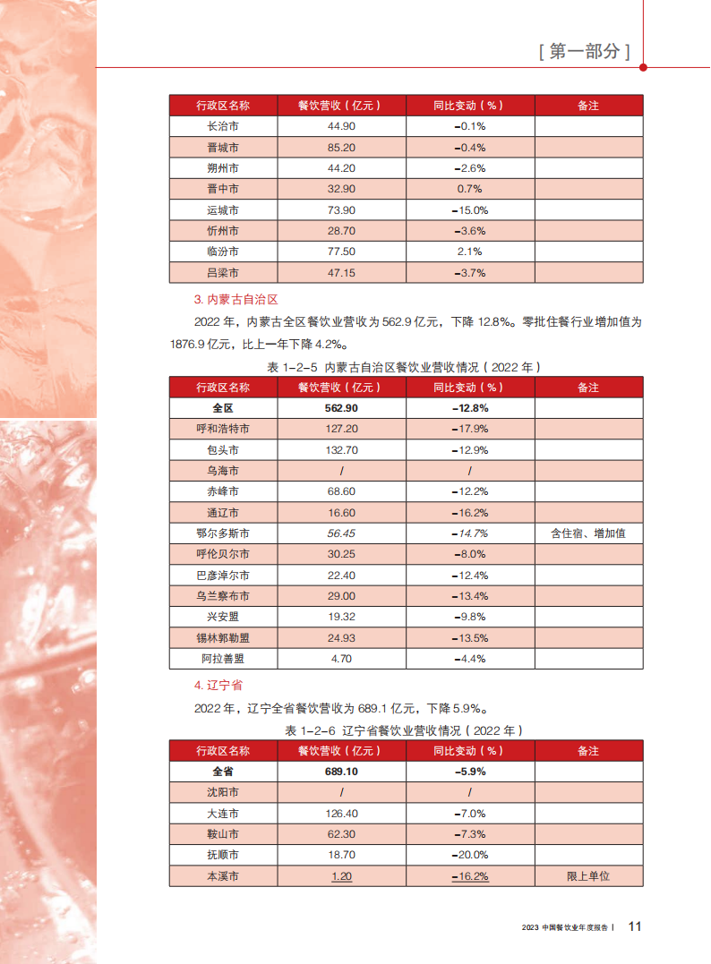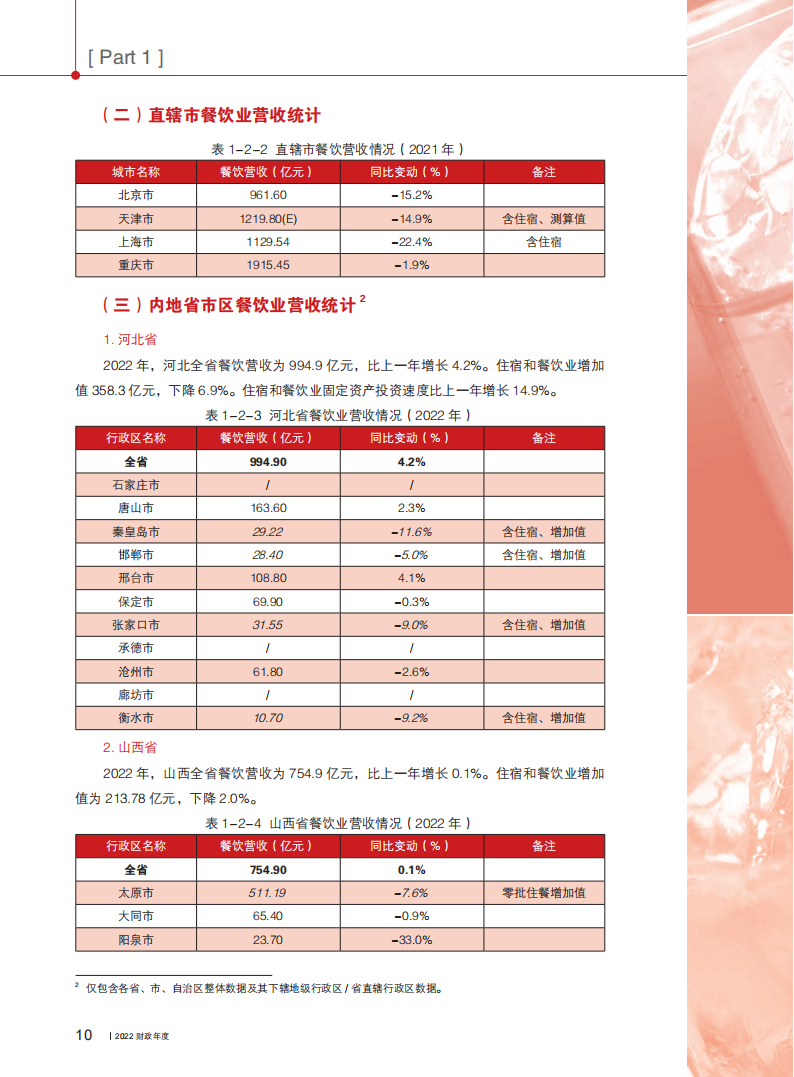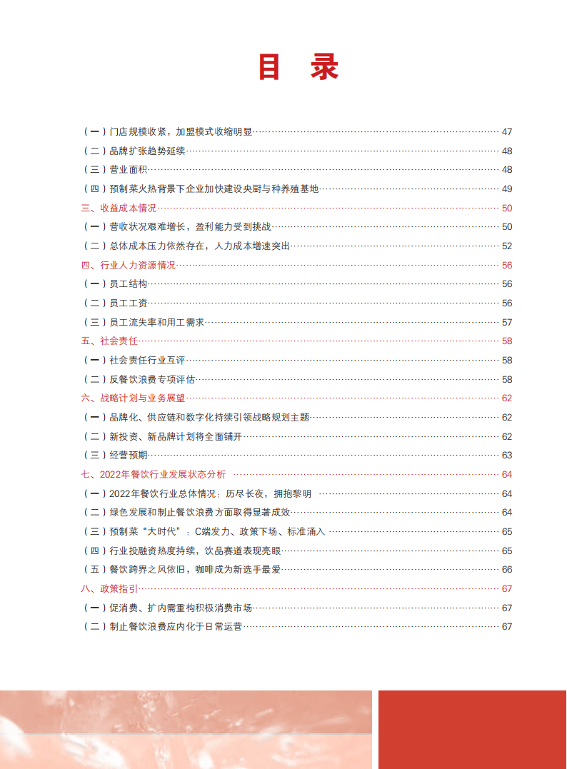 本年度报告由中国餐饮行业统计年报、餐饮业领跑者企业领跑者指数、行业整体经营状况分析、上市公司分析、餐饮企业家信心指数分析及优秀经营案例选集六大部分组成。其中,行业整体经营状况分析以内地 23 个省、区、市的百余家餐饮企业和集团的调研数据为基础。调研企业包含内资民营企业、国有企业、港澳台资企业和外商企业,涵盖正餐、火锅、团餐、快餐、日料、西餐、茶饮等业态。报告通过多个维度和细分指标开展数据分析与研究,全方面、立体式解析并呈现行业现状与特点。此外,本年度报告针对反餐饮浪费、行业人力资源等热点话题增设了单独的数据板块供读者参考。
