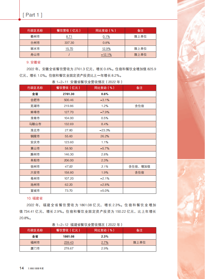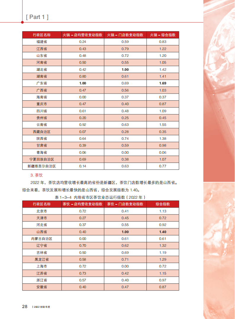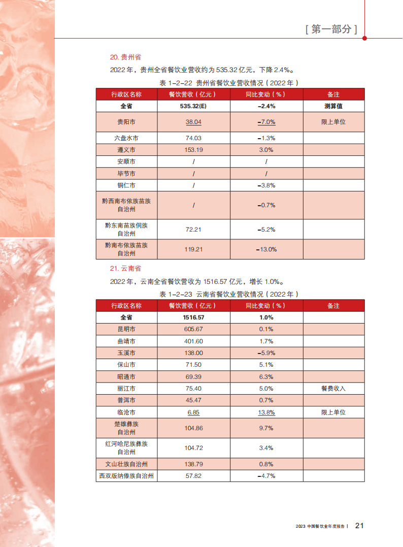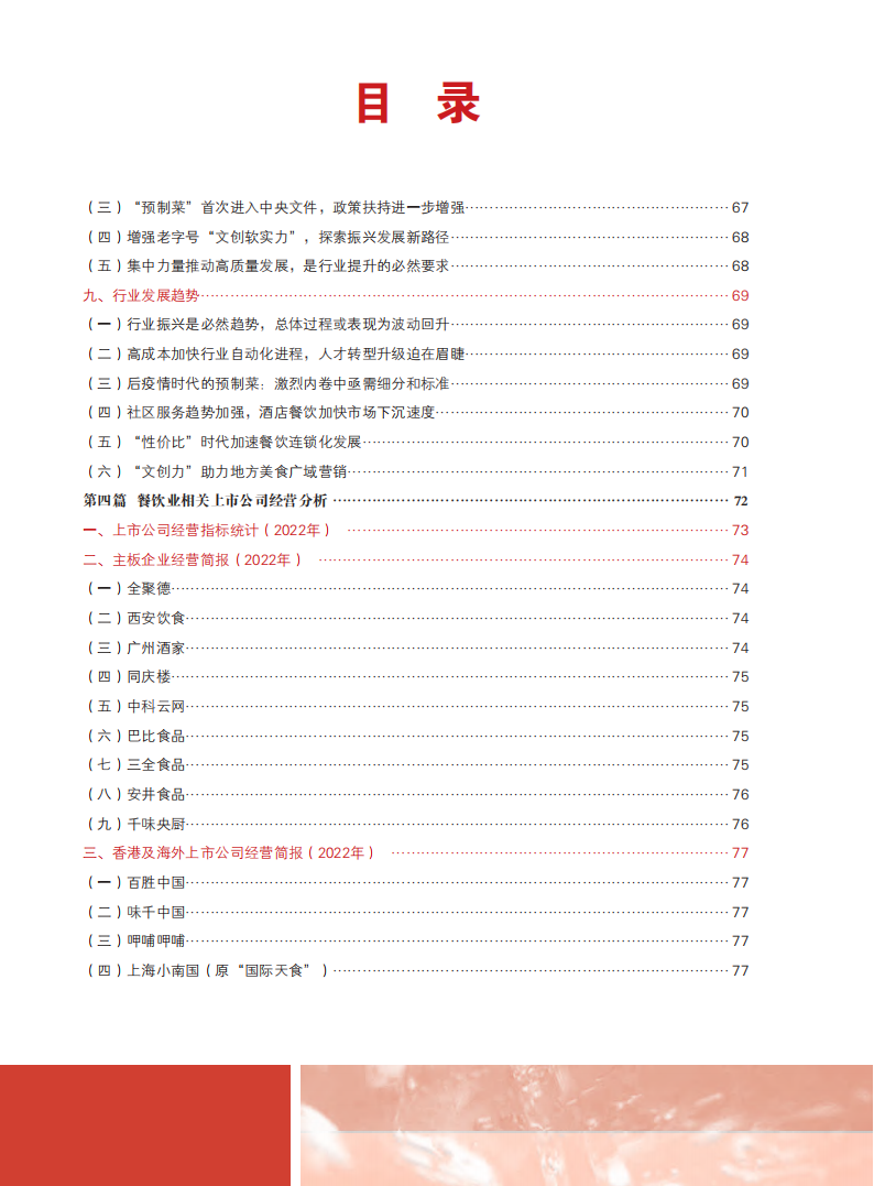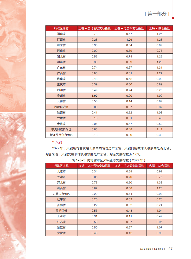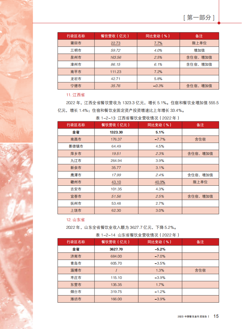 本年度报告由中国餐饮行业统计年报、餐饮业领跑者企业领跑者指数、行业整体经营状况分析、上市公司分析、餐饮企业家信心指数分析及优秀经营案例选集六大部分组成。其中,行业整体经营状况分析以内地 23 个省、区、市的百余家餐饮企业和集团的调研数据为基础。调研企业包含内资民营企业、国有企业、港澳台资企业和外商企业,涵盖正餐、火锅、团餐、快餐、日料、西餐、茶饮等业态。报告通过多个维度和细分指标开展数据分析与研究,全方面、立体式解析并呈现行业现状与特点。此外,本年度报告针对反餐饮浪费、行业人力资源等热点话题增设了单独的数据板块供读者参考。