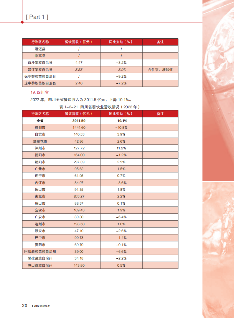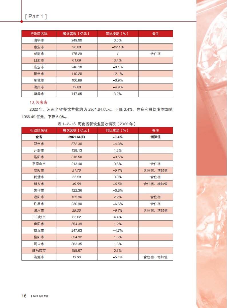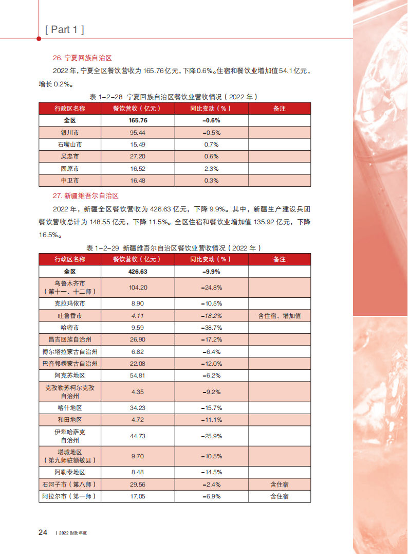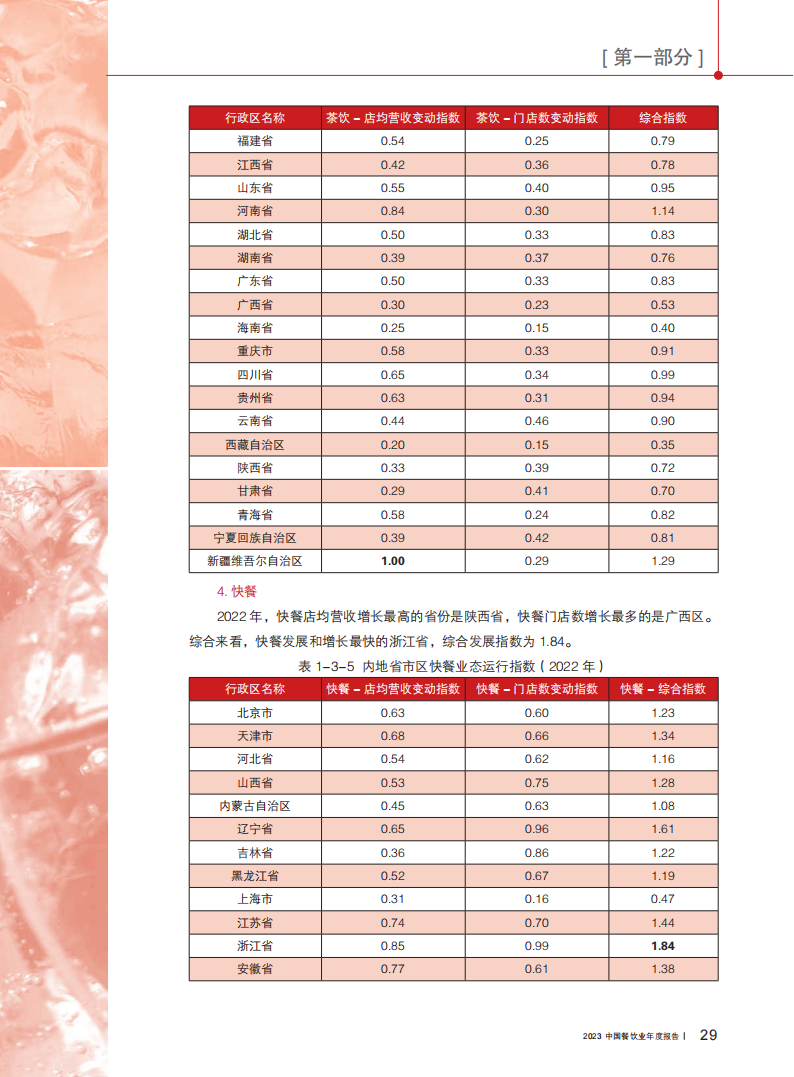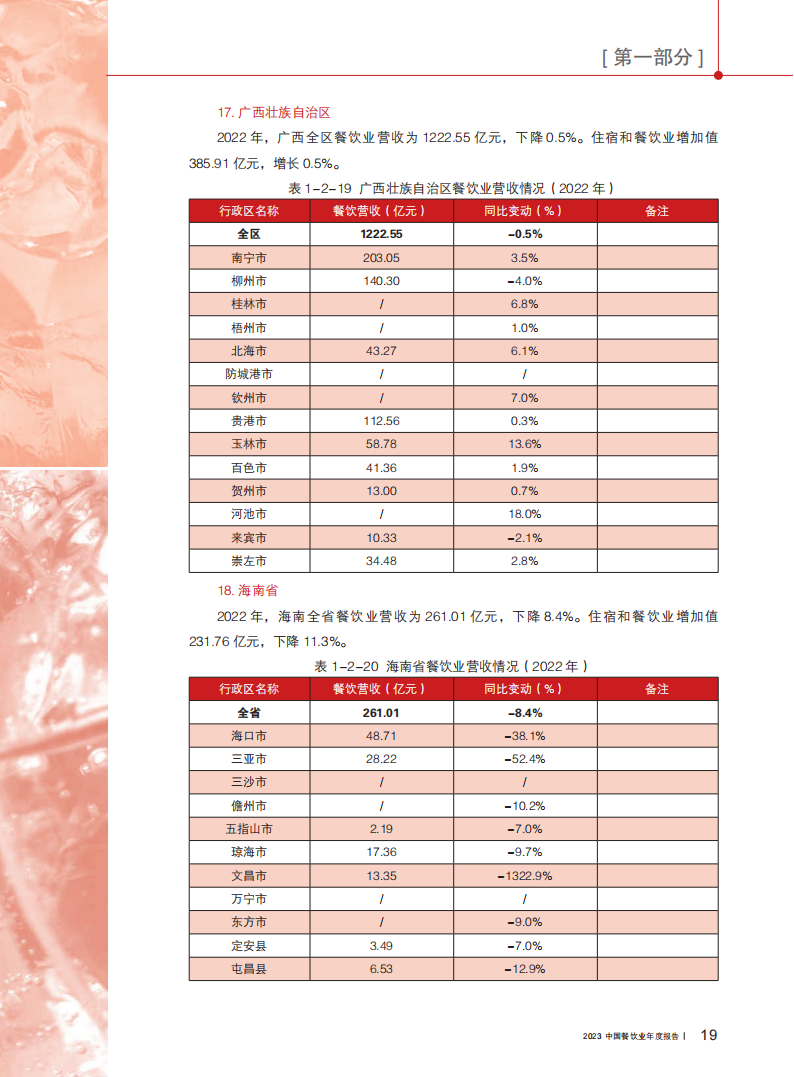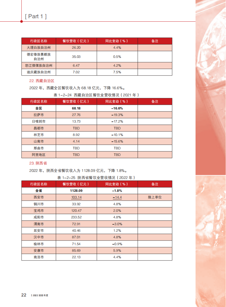 本年度报告由中国餐饮行业统计年报、餐饮业领跑者企业领跑者指数、行业整体经营状况分析、上市公司分析、餐饮企业家信心指数分析及优秀经营案例选集六大部分组成。其中,行业整体经营状况分析以内地 23 个省、区、市的百余家餐饮企业和集团的调研数据为基础。调研企业包含内资民营企业、国有企业、港澳台资企业和外商企业,涵盖正餐、火锅、团餐、快餐、日料、西餐、茶饮等业态。报告通过多个维度和细分指标开展数据分析与研究,全方面、立体式解析并呈现行业现状与特点。此外,本年度报告针对反餐饮浪费、行业人力资源等热点话题增设了单独的数据板块供读者参考。