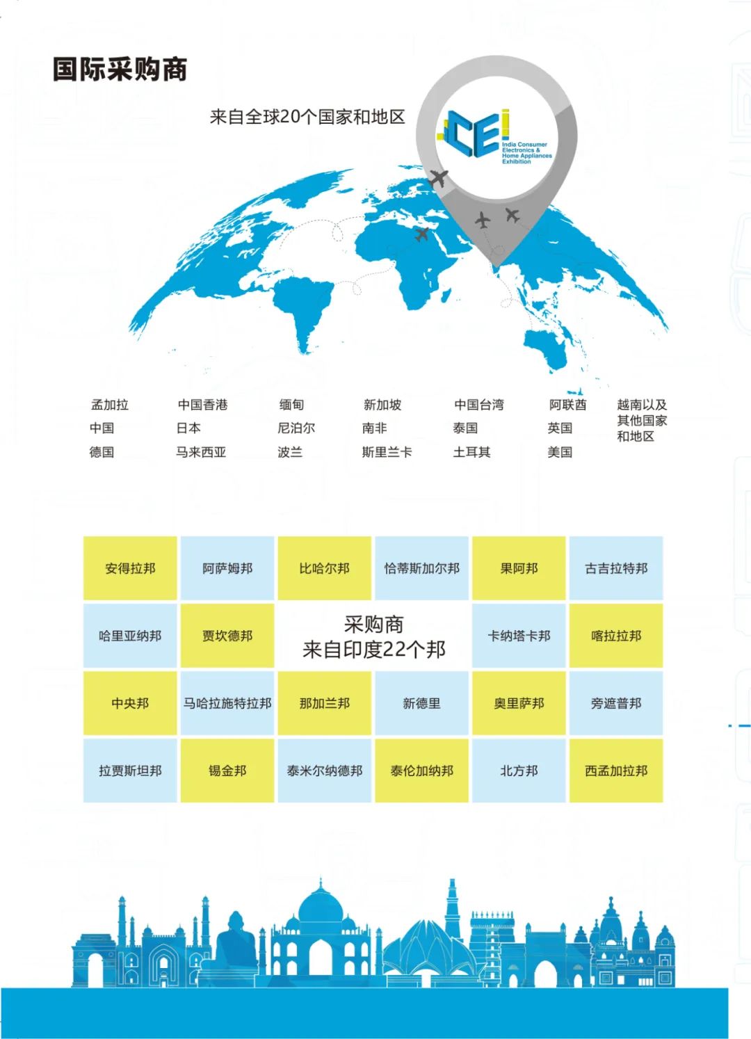2023年展览会将预计吸引来自全球10多个国家和地区的400家参展企业、超过1万位印度及南亚专业采购商前往展览会进行参观采购。