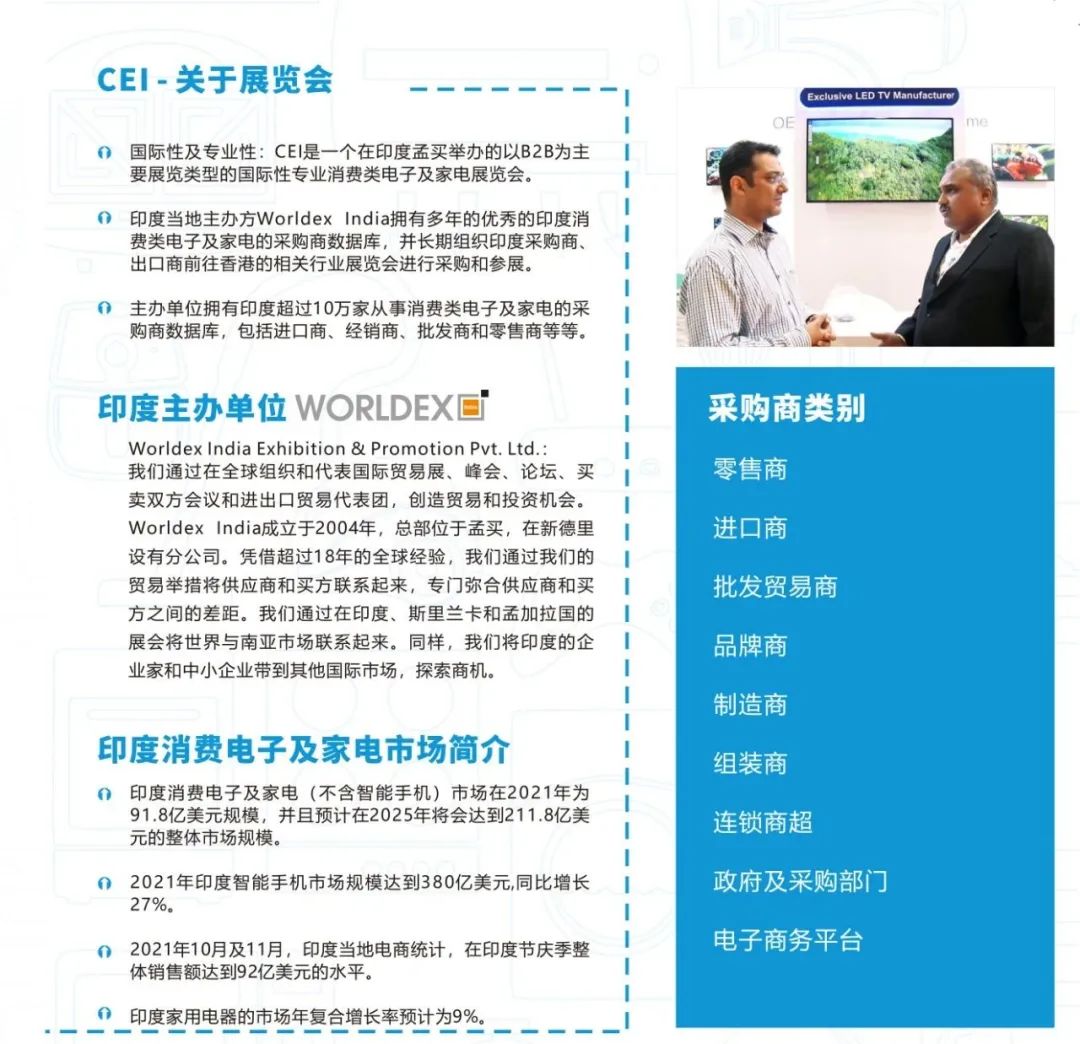印度国际消费类电子及家电展览会(Consumer Electronics India) 是由世展展览印度有限公司Worldex India Exhibition & Promotion Pvt. Ltd.以及新加坡淡马锡控股(Temasek Holdings)及新加坡报业控股SPH旗下展览公司——(新加坡)星域展览联合主办的印度大型国际性消费类电子展览会。