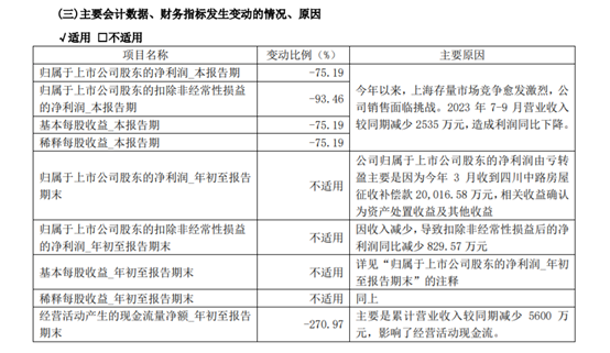 今年消费全面放开后,不少白酒企业的业绩全面下降,但是,在三季度财报发出后,知名黄酒厂商金枫酒业出现了业绩下滑。近日,金枫酒业发布了第三季度财报,财报显示,公司在前三季度的总营收是3.6亿元,同比下滑13.45%;实现归母净利润(下称“净利润”)1.18亿元,但是,相比去去年来说,今年的净利润是上涨,去年同期的时候公司亏损为1701万元。那么,在业绩下降的时候,公司能保证净利润上涨,是不是说明今年的业绩比较好呢?其实并不是,今年的净利润能实现同比扭亏,还是因为公司在3月份的时候收到了四川中路房屋征收补偿款约2亿元,相关收益确认为资产处置收益及其他收益。而如果剔除这些收益后,可以看出,金枫酒业今年的扣非净利润仍旧延续2022年同期的亏损局面,为-2780.55万元,比去年亏损还多。作为一家酒业公司,在2008年前公司是上海市第一食品有限公司,在2008年开始转型,开始聚焦黄酒产业,而9月份,公司更名为“上海金枫酒业股份有限公司”,证券简称变更为“金枫酒业”,完成主业转型。随着这几年市场的需求减少,黄酒产业开始受到影响,导致金枫酒业又开始在2014年后开发了葡萄酒业务,但是依然没有止住业绩下降的趋势,到了2021年,金枫酒业的净利润依然是亏损1285万元。到了2022年,公司的营收6.62亿元,同比增长1.88%;净利润为517.19万元,同比由亏转盈。这一年比起2021年的亏损,起码净利润成正比,但是在扣非净利润方面,2020年到2022年三年都连续亏损,扣非净利润分别为-2456万元、-1866万元、-244.4万元。而到了今年前三季度的时候,公司的营收3.6亿元,同比下滑13.45%;净利1.18亿元,比起去年同期的亏损,起码转亏为盈。对于业绩下降,金枫酒业表示,主要是如今存量市场竞争激烈,导致公司销售愈加严峻,所以净利润不断下降。在剔除了房屋征收赔偿款后,公司扣非净利润以上是亏损2780.55万元,而业绩下降的时候,公司的现金流也不稳定。尤其是截止到2023年前三季度,金枫酒业的现金流为净流出,为-5997.07万元。在整个黄酒行业中,有三家黄酒巨头分别是古越龙山、会稽山和金枫酒业,但是作为黄酒行业的三巨头,金枫酒业如今却是垫底的。除它之外的古越龙山和会稽山,酒类销售都是处于收入增长的趋势。从第三季度财报来看,今年前三季度,古越龙山中高档酒销售收入8.01亿元,同比增长4.21%,普通酒收入为3.15亿元,同比增加3.03%。而会稽山的中高端黄酒前三季度实现收入5.68亿元,同比增长8.28%;普通黄酒实现营收3.01亿元,同比增长47.83%。这两位做的都比金枫酒业要好,尤其是古越龙山的高端化之路很顺畅,而在对比一下金枫酒业,金枫酒业的中高端产品和低端产品的销售收入增速比起古越龙山和会稽山都要低不少。从产品分类来看,金枫酒业的中高端、低端产品的收入均有不同程度的下降,从财报来看,前三季度,中高端产品的营收是2.61亿元,同比下降11.84%;而低端产品的营收是8916.28万元,同比下滑17.91%。并且,在上半年的时候,三家黄酒子公司都出现不同程度的亏损,导致公司的业绩更差。尤其是中高端的石库门公司净利润亏损高达1243.41万元。公司的业绩不好,导致在资本市场的股价也是一路下坡,如今的股价比起年内最高价已经跌去超过20%。商务合作:cjm321666(微信)