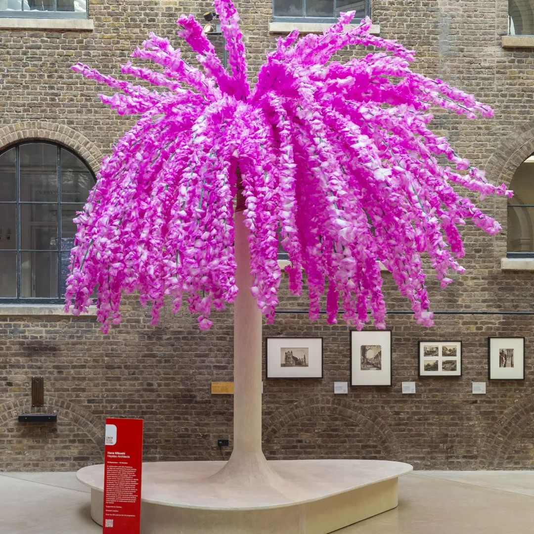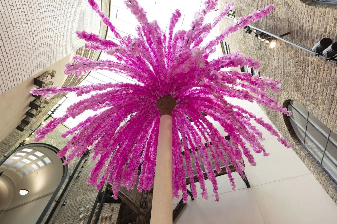 回到 V&A 的中世纪与文艺复兴展厅中,一棵与其朴实背景有着极大对比性的粉红色“人造花树”,不难成为今年展会中的“网红”之作。然而,这棵名为“花神社”(Hana Mikoshi)的装置,其实乃取材于日本岐阜县的“美浓祭”,并在和伦敦 Hayatsu Architects 建筑事务所合作下,将装饰有五万朵由日本工匠手工制作的樱花风格和纸花制成一个雕塑般的座椅。设计师称,装置的设计除了有“宣传旅游”之意,也希望展现出该地一年一度“美浓祭”时,让当地家庭、工匠和代际团体齐聚一堂,为节日制作纸神社的社区性。