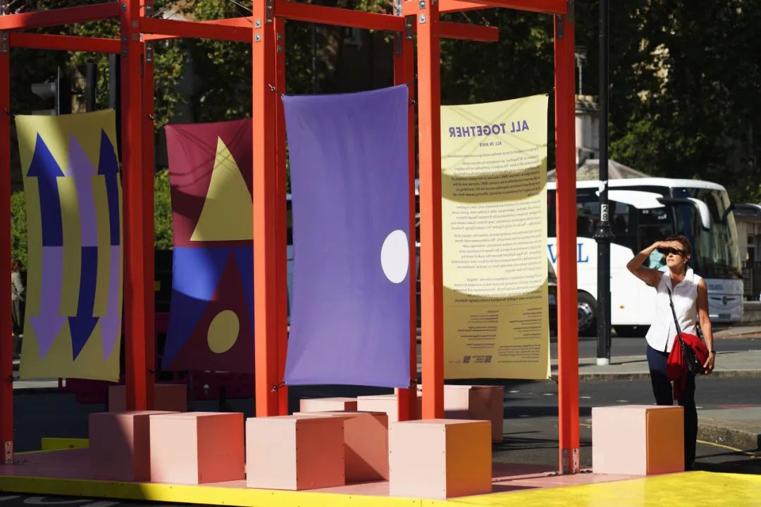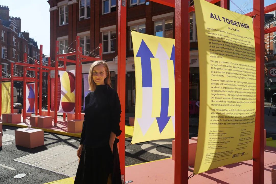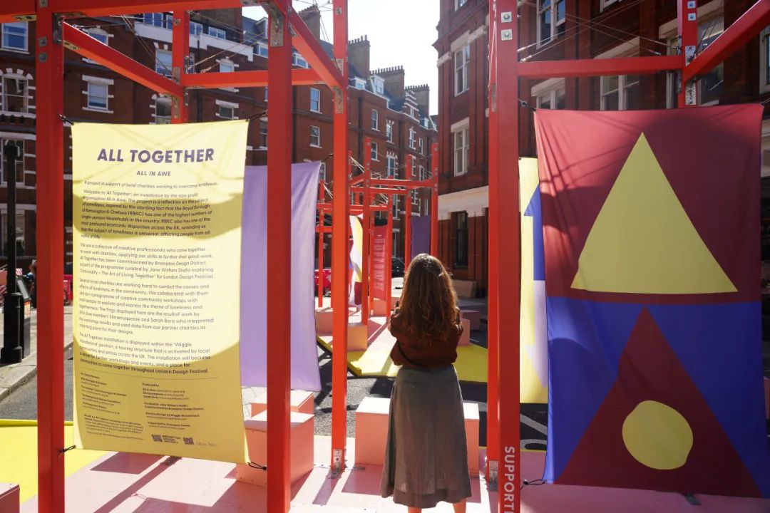 谈及装置,也不得不提到 All in Awe 于 V&A 外的布朗普顿(Brompton)设计区所开发的大型装置“All Together”。这个由广泛的设计创意人员网络组成的社会企业,旨在通过其成员的专业知识来帮助慈善机构开展重要工作。今年的装置,则在多彩与平面设计感的“国旗”悬挂中,点出了“孤独”这一人类普遍经历的主题。他们认为该问题在疫情后更为显著。所以这件被誉为是“孤独的临时纪念碑”的创作也被寄予希望能成为一种解药,吸引当地社区并提供互动和团结的空间。诚如美国社会工作者多萝西·戴(Dorothy Day)所言:“我们都知道漫长的孤独,而其解答则来自于社区。”