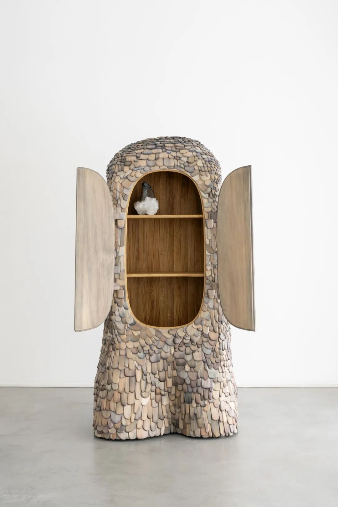 当中让人看得目不转睛的作品,皆以木料作主:比如意大利工匠 Francesco Perini 就以三块橡木圆块如石堆般的 Pebbles 座椅,其重叠并相互平衡的形态也在彻底挑战了重力定律后让人啧啧称奇;而柏林设计师 Lukas Wegwerth 则将手工雕刻的木瓦拼凑成 Armadillo 木柜——如其名,看似就如自然界中濒临灭绝的犰狳。