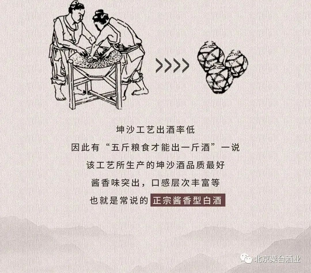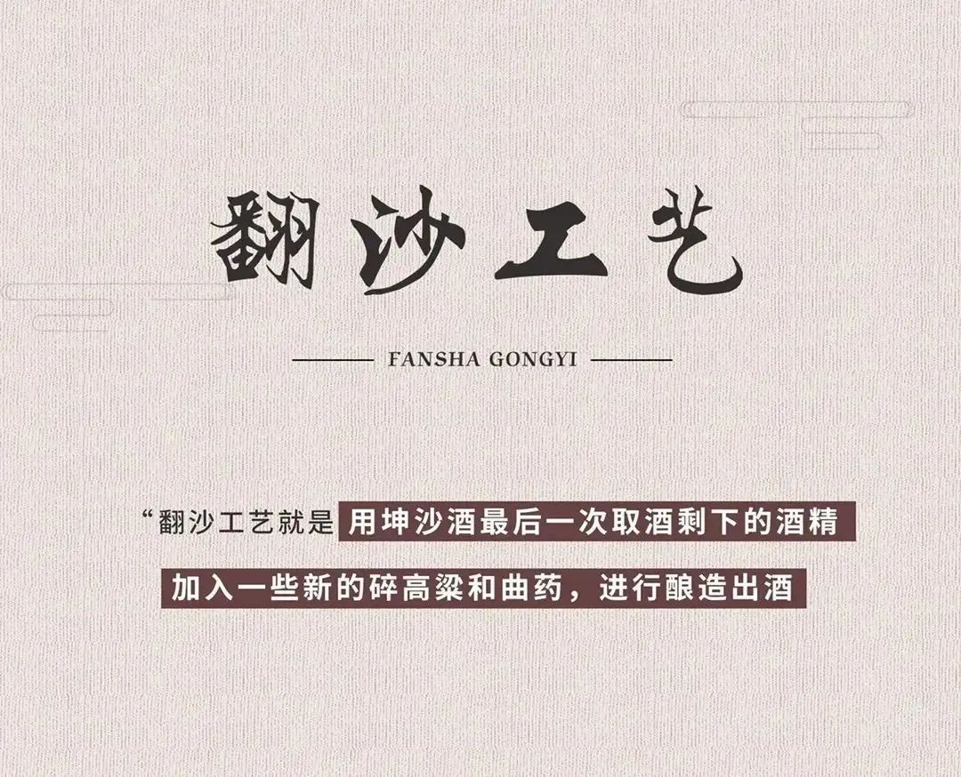 酱香型白酒的翻沙酒工艺是将坤沙酒最后第九次蒸煮后丢弃的酒糟再加入一些磨碎的高粱、新曲药后蒸煮酿制,不仅生产周期端而且出酒率特别高。