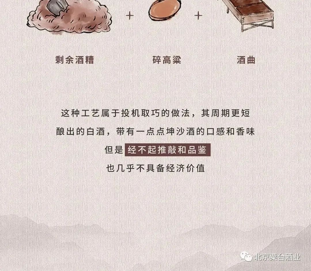 它同样会用到坤沙酒最后第九次蒸煮后丢弃的酒糟,然后将其与食用酒精蒸馏,工艺非常简单,没什么特殊要求。