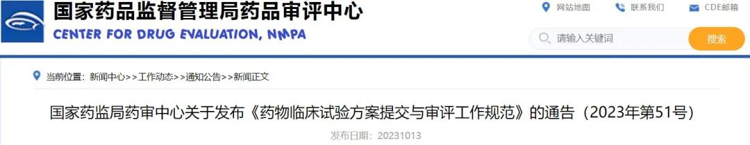 国家药监局药审中心关于发布《药物临床试验方案提交与审评工作规范》的通告(2023年第51号)
