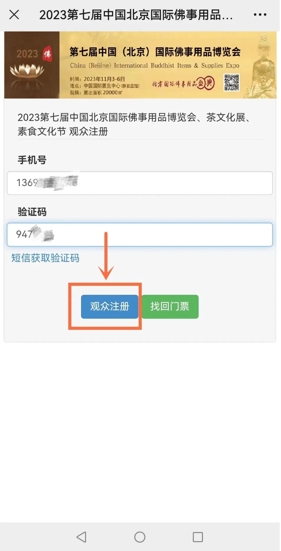 进入预登记页面后,今年第一次进行预登记的朋友,填完手机号点击“短信获取验证码”后,将收到的验证码信息进行填写,并点击“观众注册”。