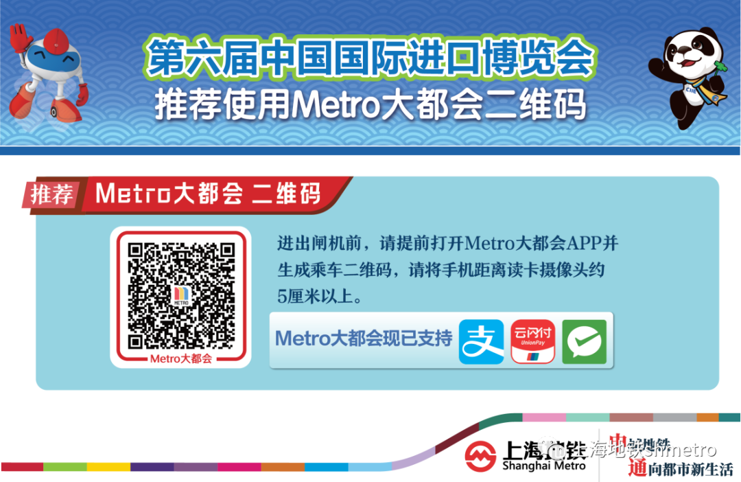 为避免观展乘客集中离场后排队购票,展会期间,建议参展乘客在进站前购买好返程车票、一日票或优先下载“Metro大都会”APP直接刷二维码乘坐上海地铁。