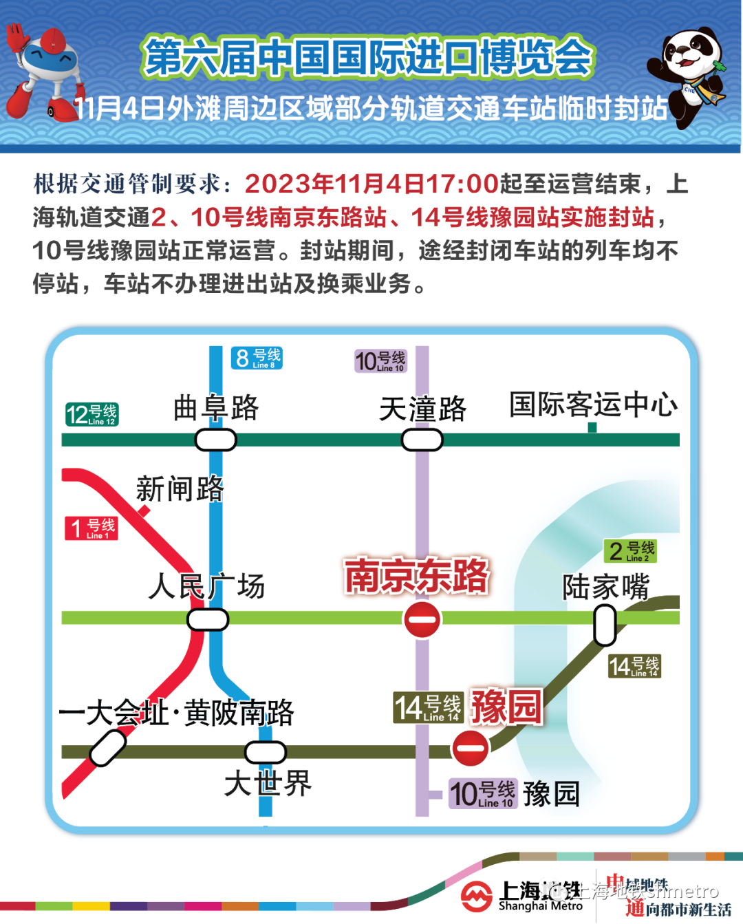 根据交通管制要求,11月4日17:00时起至运营结束,地铁2、10号线南京东路站,14号线豫园站将计划实施封站跳停(10号线豫园站仍正常运营);11月5日自运营开始起至14:00止,2号线徐泾东站将计划实施封站。封站时段内,在2、10号线南京东路站,14号线豫园站,2号线徐泾东站不能上下车,地铁站出入口也将同步关闭,乘客不能进出车站。届时,车站将加强站内广播宣传、导向设置、站台站厅秩序维护等工作。此外上述车站的临时封站时间或将根据相关部门要求有所调整,届时请乘客配合现场指引通行。