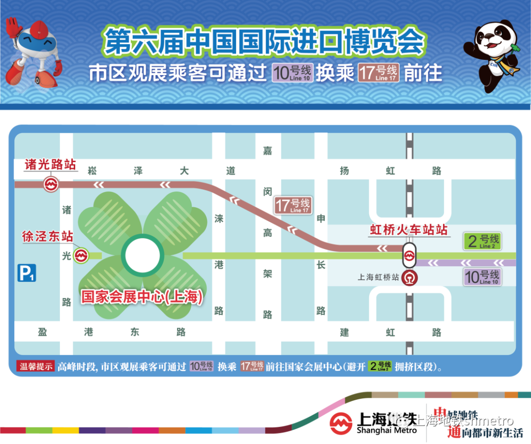 展会期间,由于2号线客流压力较大,建议观展乘客乘坐10号线至虹桥火车站站,再换乘17号线至诸光路站前往国家会展中心,从而避开2号线大客流区段。散场时,建议观展乘客在17号线诸光路站进站,乘坐1站至虹桥火车站站后,再换乘10号线前往市中心及换乘其他线路。