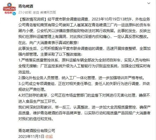消息面上,11月1日深夜,平度发布就“小便风波”进行官方通报,青岛啤酒也在其社交平台官方账号发布致歉声明。