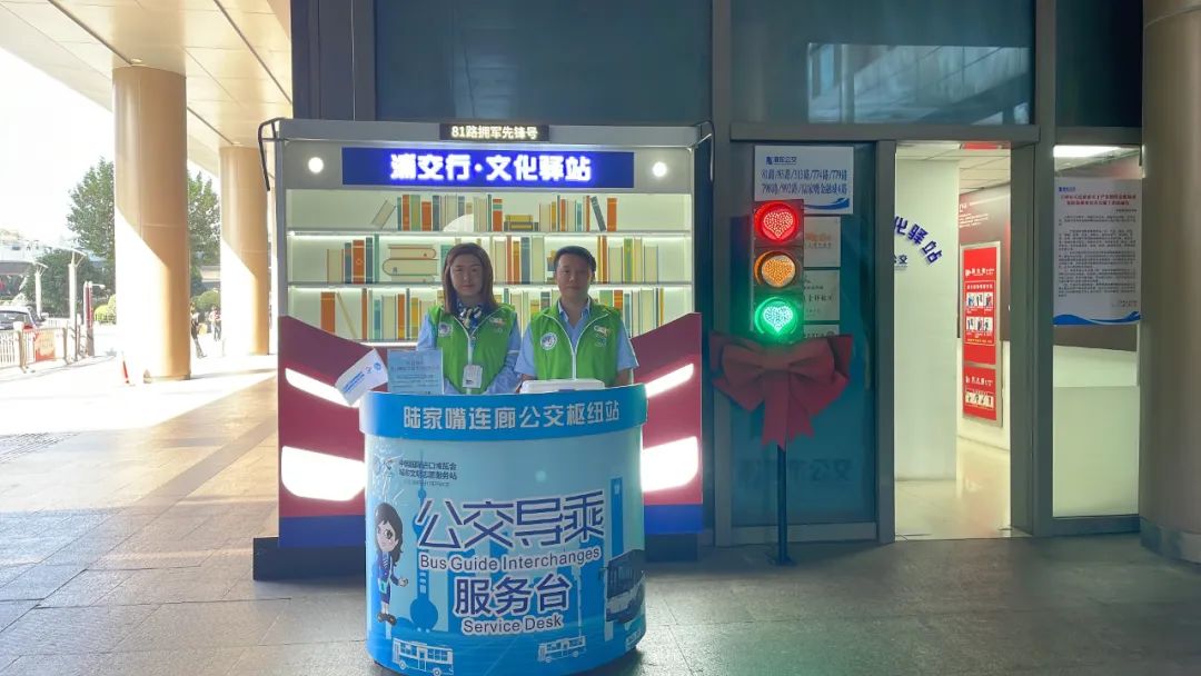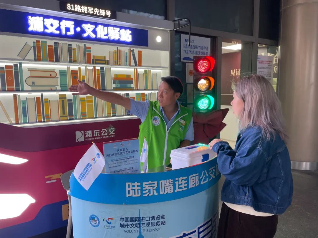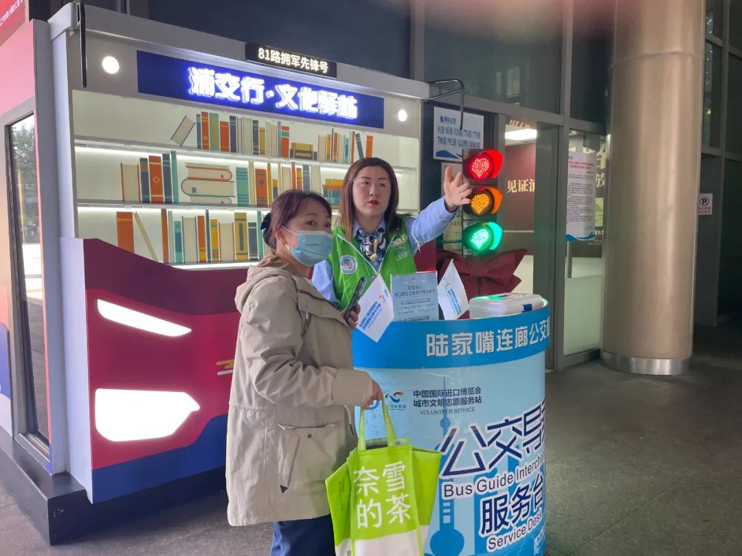 从11月1日起至11月10日,服务岗的2名志愿者从上午9点半至下午4点全天候为广大市民游客提供公交导乘、手机充电、兑换零钱、急救医药箱、景点介绍、失物招领等便民服务,解决乘客在旅途上的不便和困难。导乘台上还整齐摆放着进博会的宣传册供游客翻阅。此外,当遇到极端恶劣天气或其他突发事件造成游客滞留时,志愿者们还将协助开展应急救援、引导安抚、后勤保障等工作。