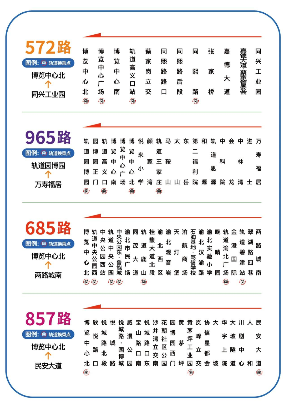 2、重庆北(龙头寺)火车站:乘坐轨道三号线抵达红旗河沟,换乘轨道六号线抵达国博中心站;或坐轨道三号线抵达鸳鸯站,换乘国博中心专线车抵达——重庆国际博览中心南区展馆;乘坐轨道十号线抵达悦来站。
