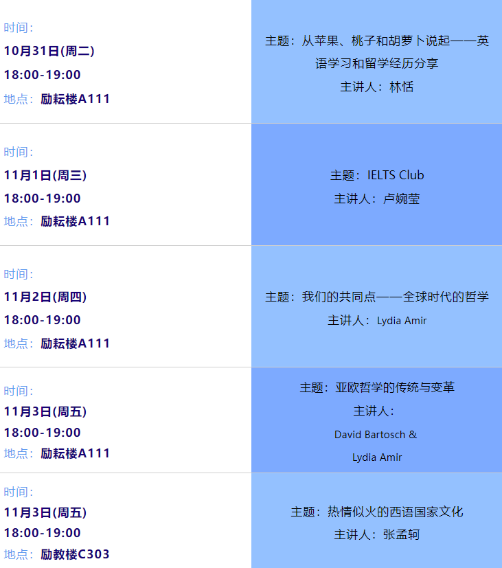 2023-2024学年秋季学期晨读和第9周晚间活动安排如下,晚间活动提前报名的同学方可到现场参与活动,进行打卡。以报名成功的打卡记录为准。