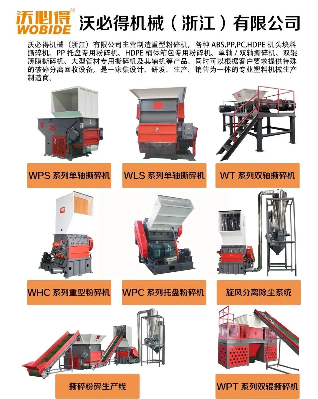 沃必得机械(浙江)有限公司主营制造重型粉碎机、各种ABS,PP,PC,HDPE机头块料撕碎机、PP托盘专用粉碎机、HDPE桶体箱包专用粉碎机、单轴/双轴撕碎机、双辊薄膜撕碎机、大型管材专用撕碎机及其辅机等产品。同时可以根据客户要求提供特殊的破碎分离回收设备,是一家集设计、研发、生产、销售为一体的专业塑料机械生产制造商!