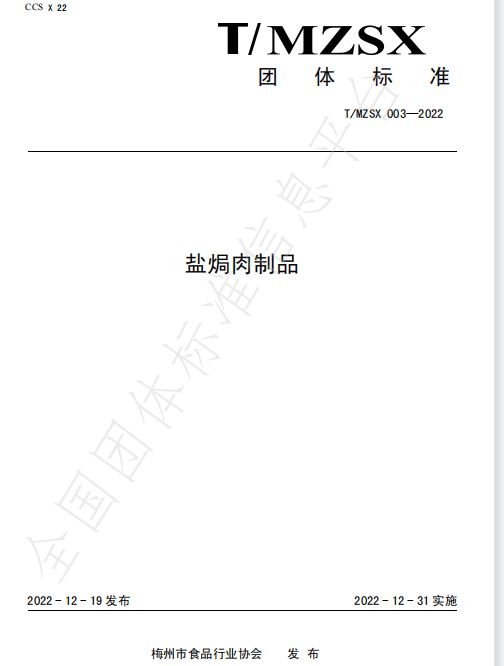 由广东裕丰食品股份有限公司、金苑食品(广东)有限公司、梅州市客迁食品有限公司、梅州市向丽食品有限公司、梅州市振城食品有限公司、广州酒家集团利口福(梅州)食品有限公司、梅州市金绿现代农业发展有限公司、兴宁市贵食食品连锁有限公司、梅州市南甄食品有限公司、梅州市尚记食品有限公司、梅州市乐得鲜食品有限公司、梅州市客居食品有限公司、梅州市客商食品有限公司等肉制品生产企业共同起草的梅州市食品行业协会团体标准《盐焗肉制品》,完成了团体标准的制定流程,经专家审定后正式发布,并于2022年12月31日正式实施。