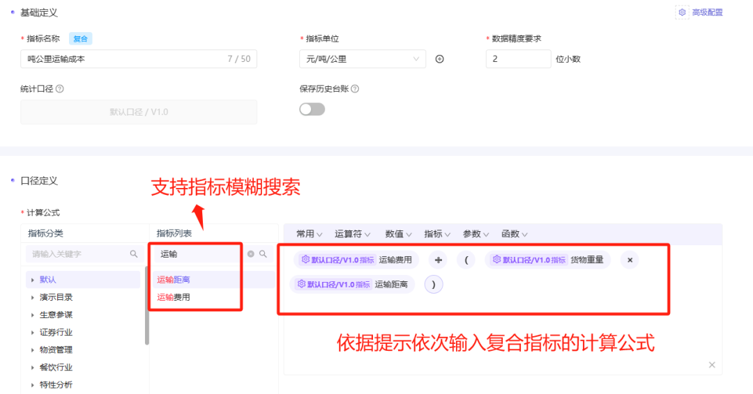 用户可以使用复合指标的公式编辑器,搜索相关的原子指标作为计算因子,即可得到对应的复合指标和计算结果。