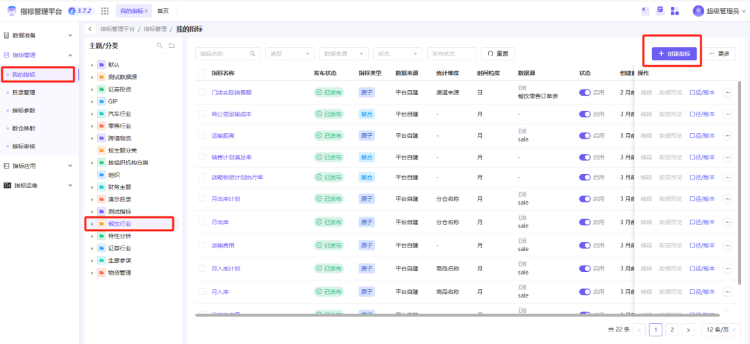 登录数智云·智能指标管理平台,进入“我的指标”,选择“餐饮行业”的主题,点击右上角“创建指标”的按钮,开始创建原子指标。