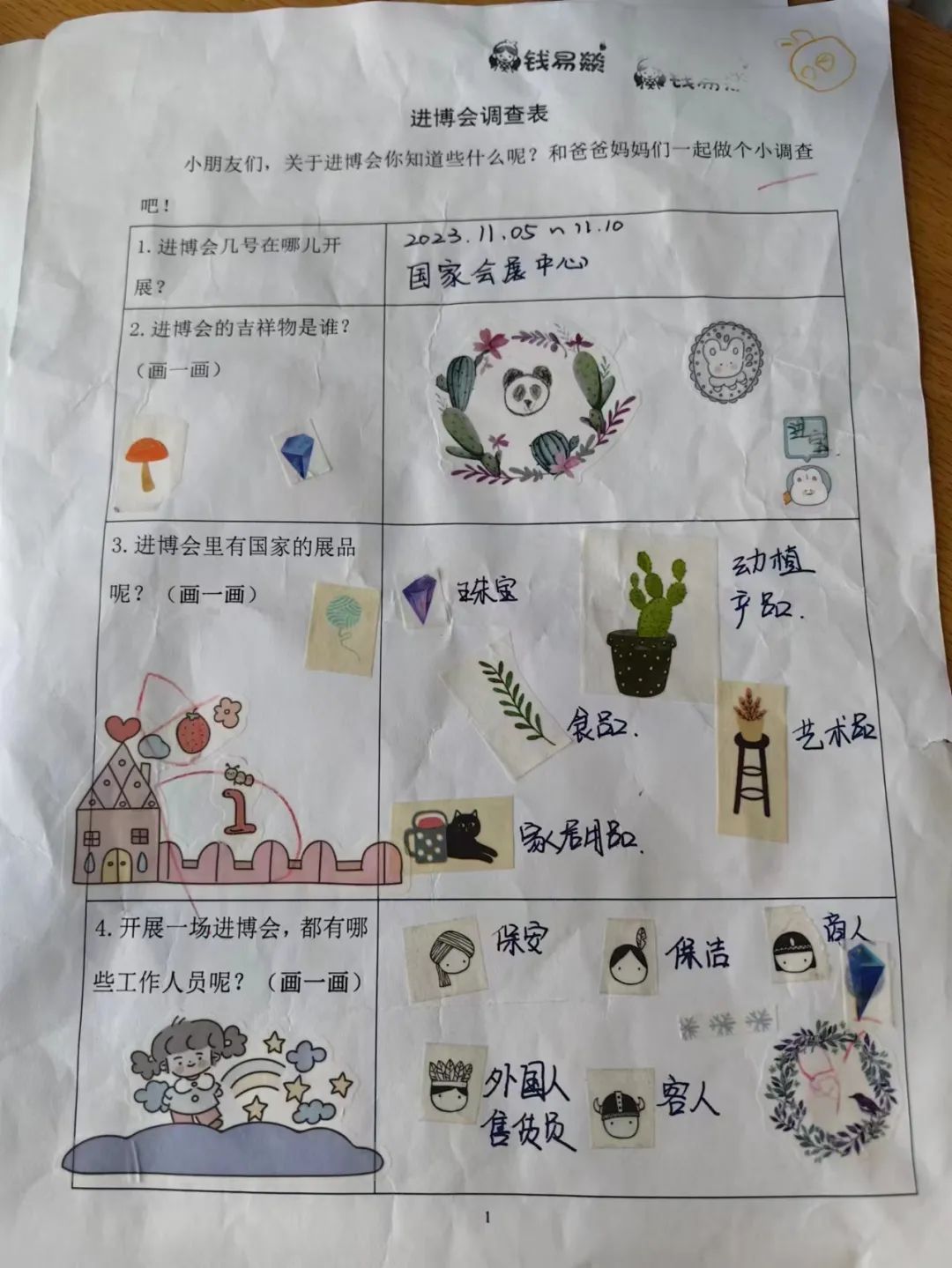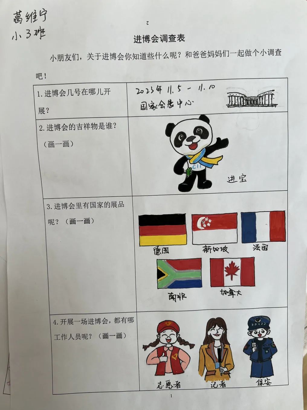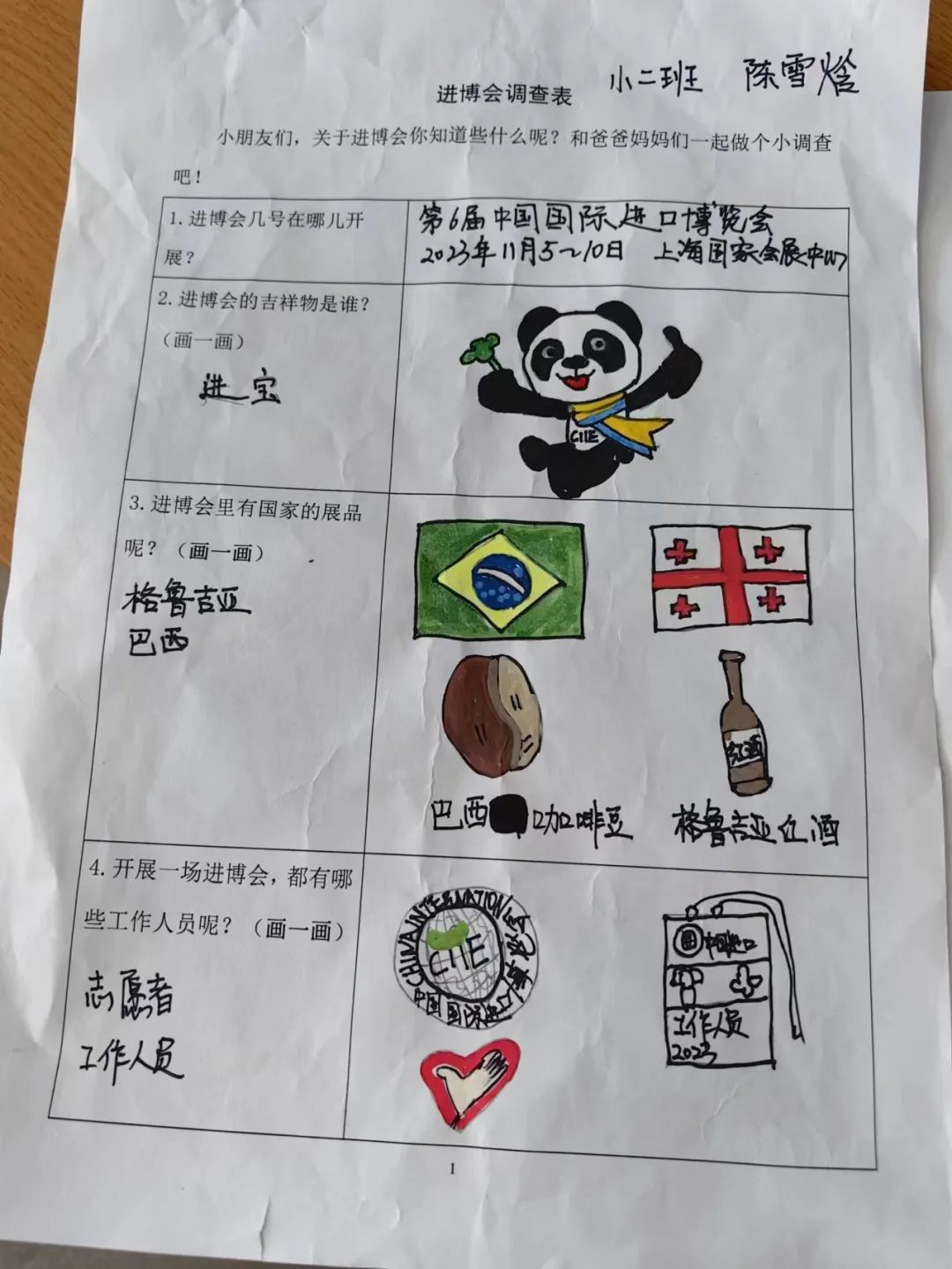 关于进博会你了解多少呢?幼儿与家长共同收集关于进博会的标志、吉祥物,会标、举办地、举办时间、参展国家,与爸爸妈妈一起找找身边的“进博会”。