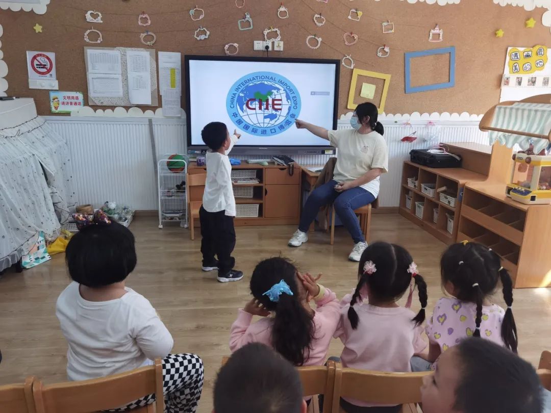 集体教学活动中,老师们通过视频、故事、宣传海报等形式,让孩子们对进博会有进一步的了解。