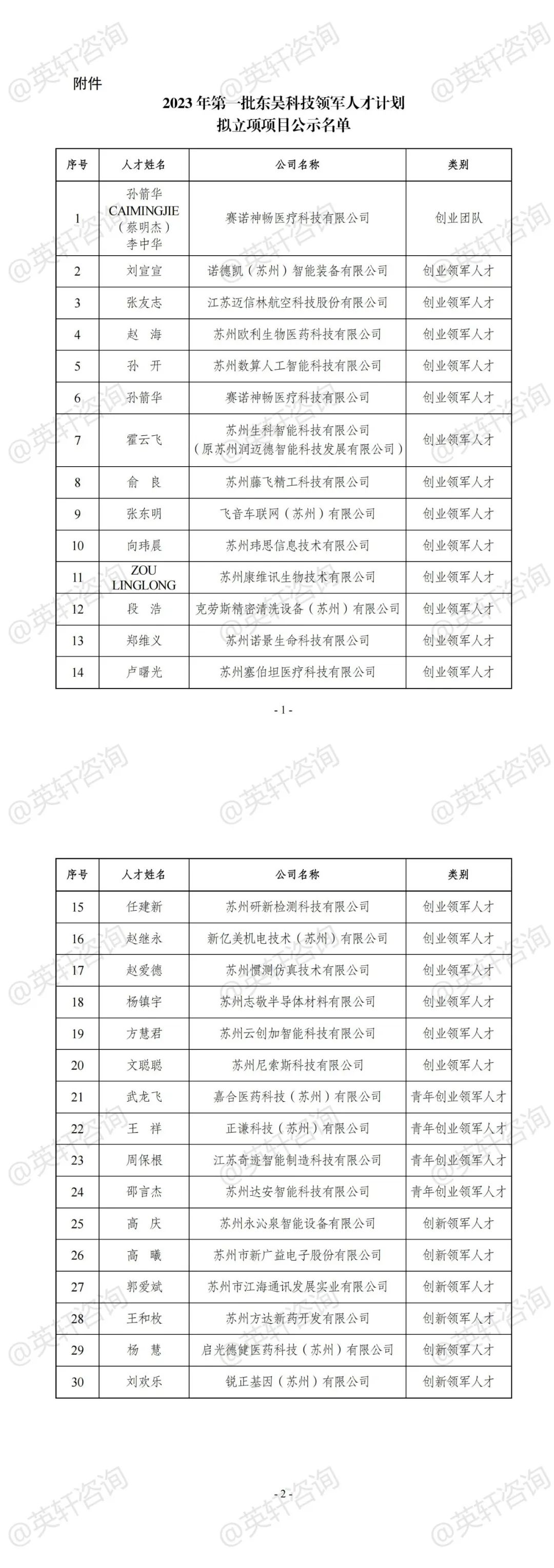 根据《关于支持东吴科技领军人才高质量发展的若干政策措施》《东吴科技领军人才计划实施细则》(吴政办〔2022〕40号)文件精神,经单位自主申报、属地主管部门审核推荐、技术评审、面试答辩、实地考察等程序,现对2023年第一批东吴科技领军人才计划拟立项项目名单进行公示: