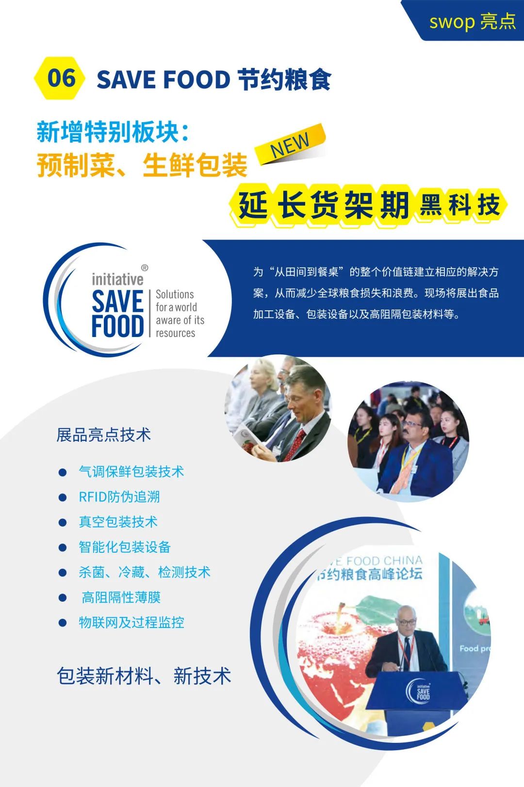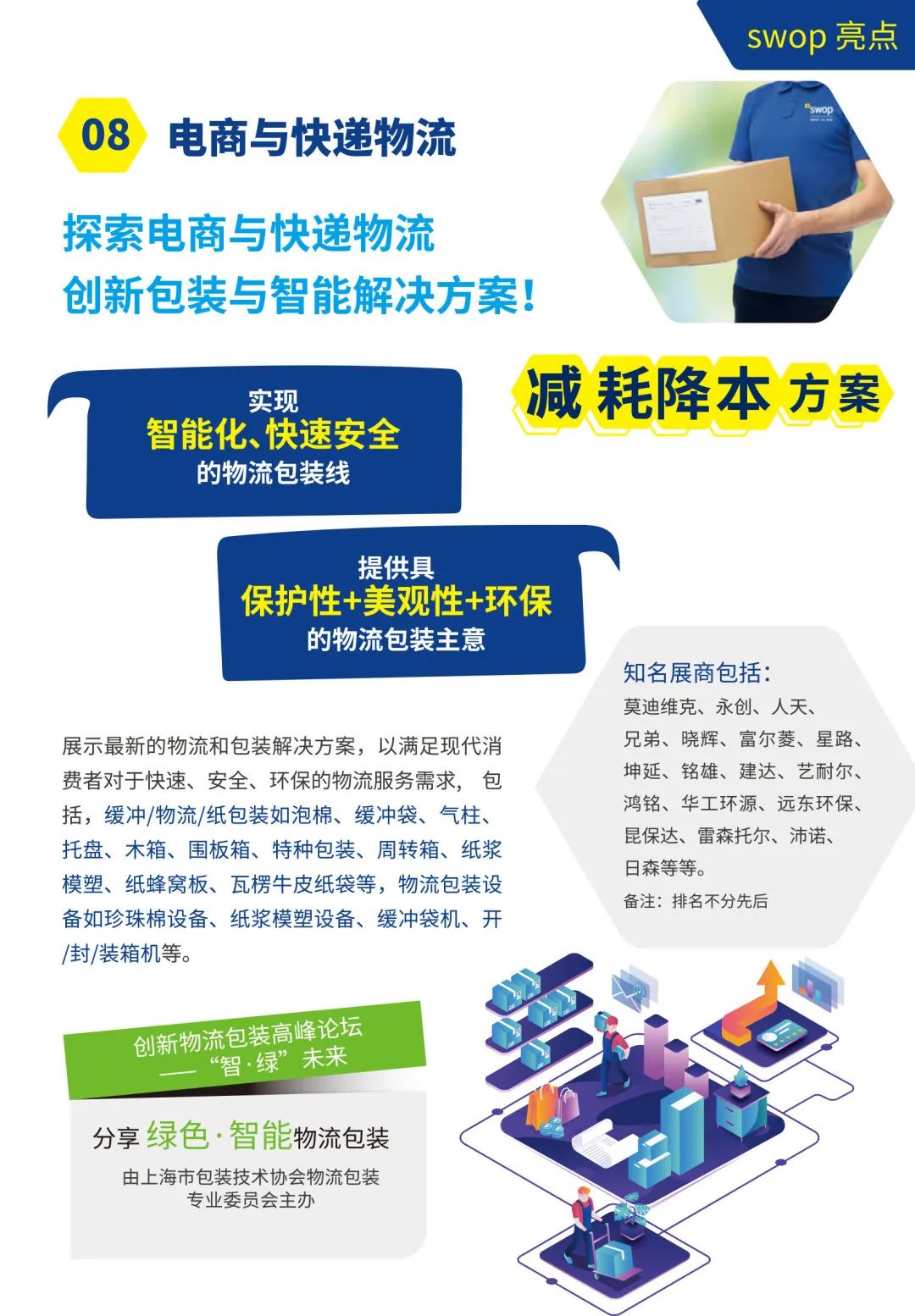 作为全球领先包装展 interpack 的联盟成员以及包装行业具有影响力的展会之一,包装世界(上海)博览会(Shanghai World of Packaging,以下简称“swop”)以其国际化、专业化的特点,吸引了众多海内外知名包装企业及专业观众的积极参与。今年,swop 将于2023年11月22-24日在上海新国际博览中心盛大举行!本届展会预计展出面积逾 62,000平方米,吸引了全球近900家中外展商共同参与。swop致力为包装业界提供高度开阔的视野,以及具有国际化特色的包装行业新动向,助力促进创新理念的实际应用,让包装专业人士成为高效的包装从业者。