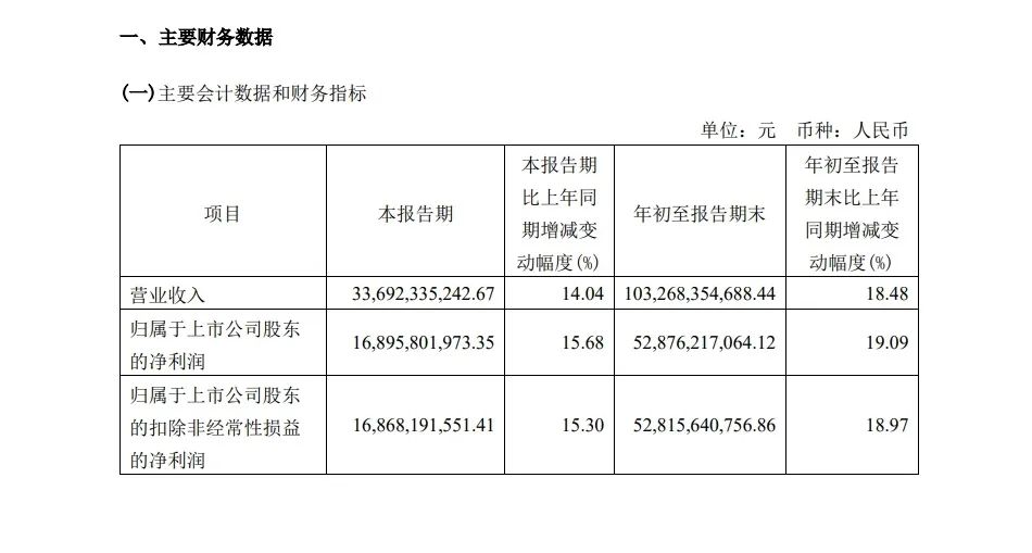 此前不久,贵州茅台发布三季报,2023年1至9月,公司实现营收1032.68亿元,同比增加18.48%;归母净利润约528.76亿元,同比增加19.09%。第三季度贵州茅台营收336.92亿元,同比上涨14.04%;归母净利润168.95亿元,同比增长15.68%。