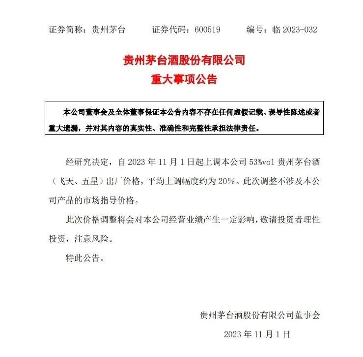 10月31日,茅台深夜发布公告,宣布自11月1日起上调本公司53%vol贵州茅台酒(飞天、五星)出厂价格,平均上调幅度约为20%。此次调整不涉及本公司产品的市场指导价格。