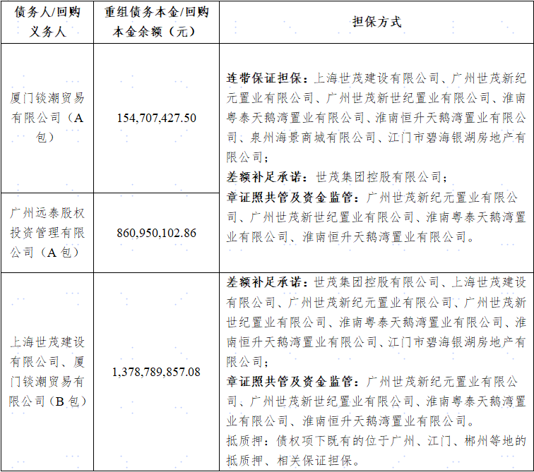 2020年4月,我公司对其中9户债权(资产包A)进行了重组,重组债务人为分别为厦门锬潮贸易有限公司(承债金额361,879.38万元)、广州远泰股权投资管理有限公司(承债金额89,294.10万元),重组期限至2022年9月30日止,由上海世茂建设有限公司及其关联方为前述重组债务提供连带保证担保或承诺差额补足;其余6户债权(资产包B)至目前未重组,除债权既有的抵押、担保等措施外,上海世茂建设有限公司承诺对资产包B在未重组情况下向我公司垫付重组补偿金,并履行在整合期3年(至2022年11月15日止)到期时按我公司本金余额及相应补偿金之和支付对价的回购义务,上海世茂建设有限公司的关联方为上海世茂建设有限公司的到期回购义务承诺差额补足。2022年9月,我公司对前述重组到期日、整合期均分别延长3年,同时厦门锬潮贸易有限公司加入同等承担上海世茂建设有限公司在资产包A、资产包B的全部义务。截至2023年10月21日,资产包A的重组债务余额为101,565.75万元,上海世茂建设有限公司对资产包B回购义务的本金余额为137,878.99万元,以及前述债务、义务逾期产生的相应违约金。