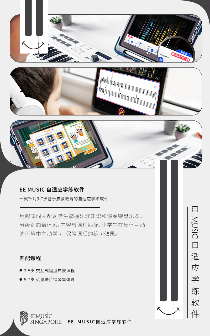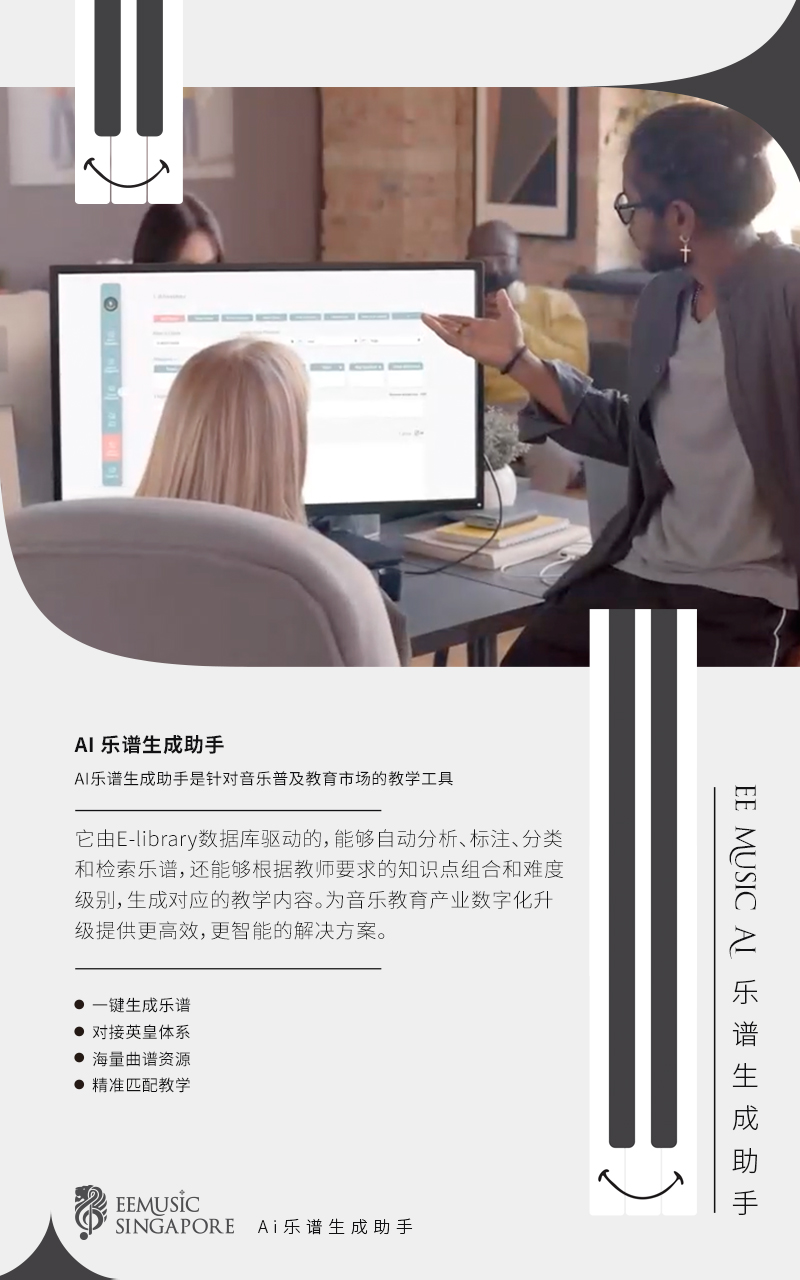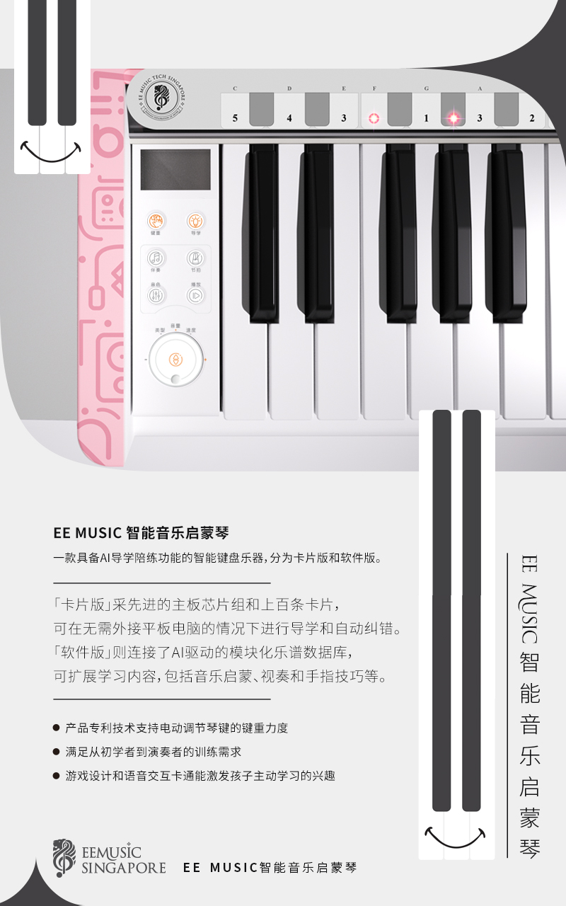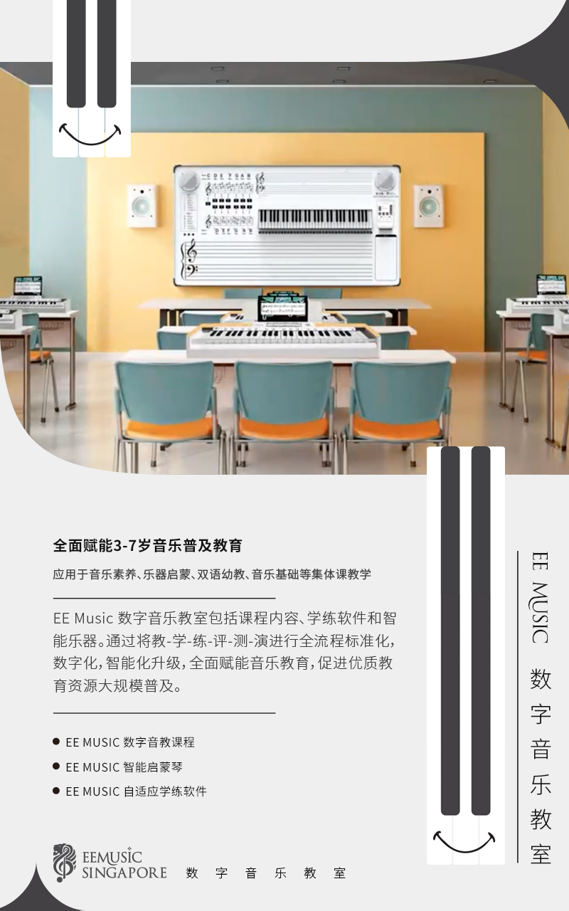 EE Music于2015年成立,是以乐谱数据库和AI为基础的音乐教育科技品牌,也是第五届新加坡中国经贸与投资论坛的政府推介项目。EE Music始终瞄准大规模的普及教育市场,推出数字音乐教室整体解决方案,并应用于音乐素养、乐器启蒙、双语幼教、音乐基础等集体课。这种方案对"教-学-练-评-测-演"全流程进行标准化、数字化、智能化升级,全面赋能音乐教育,推进优质音乐教育资源大规模普及。