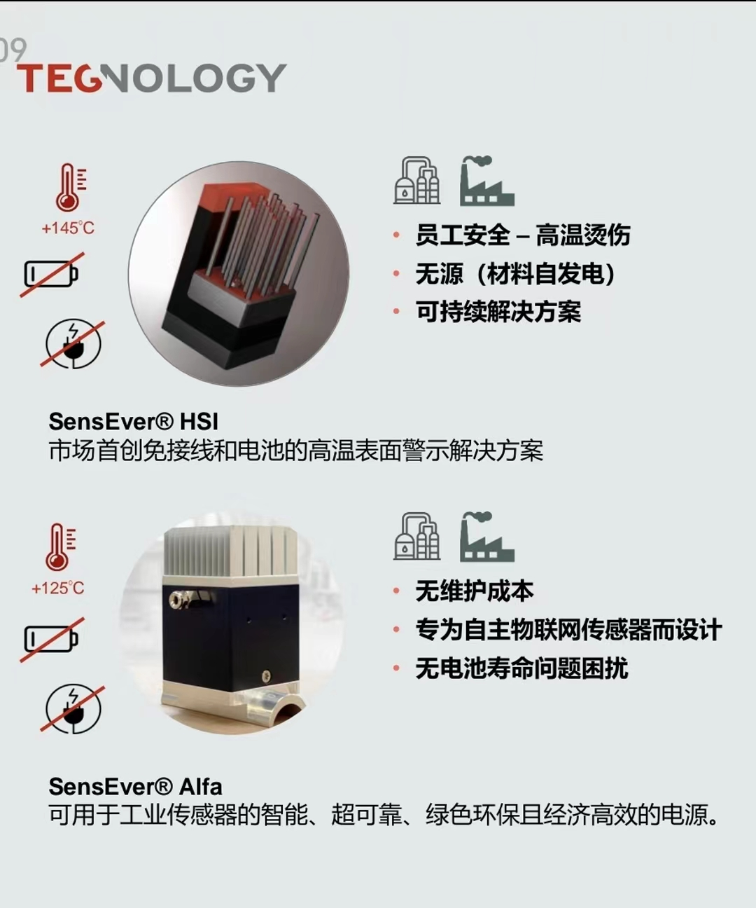 TEGnology致力于先进余热再利用材料的研发与生产。产品有自驱动传感器和供电设备,其特点都是自驱动,不需要电池或者电源供电,可广泛用于自动监测和远程测量等领域的设备。