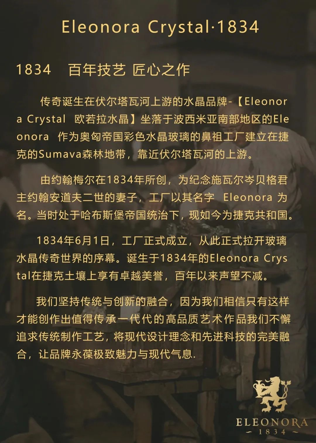 欧若拉水晶(ELEONORA CRYSTAL)品牌诞生于1834年,在捷克享有极高的美誉度,并保持声望不减。该品牌产品有水晶内饰吊灯、日用品、酒具、茶具、花瓶等。