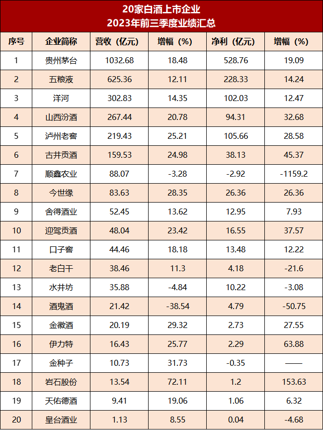 根据20家白酒上市企业所公布的2023年前三季度报告,今年前三季度,白酒上市企业共实现营收总额为3091.11亿元,同比增长16.29%;实现净利润总额为1189.8亿元,同比增长18.92%。