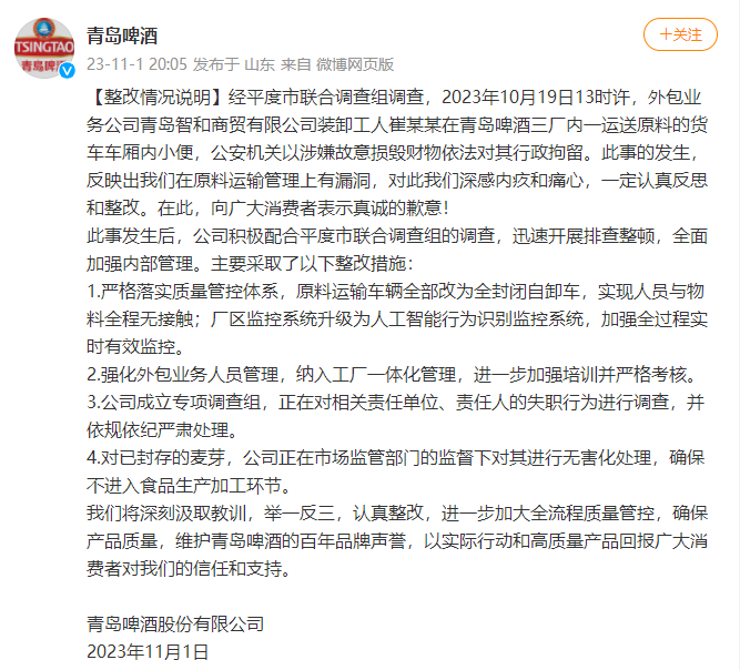 随后,@青岛啤酒就“小便事件”致歉,并采取4项整改措施,全文如下: