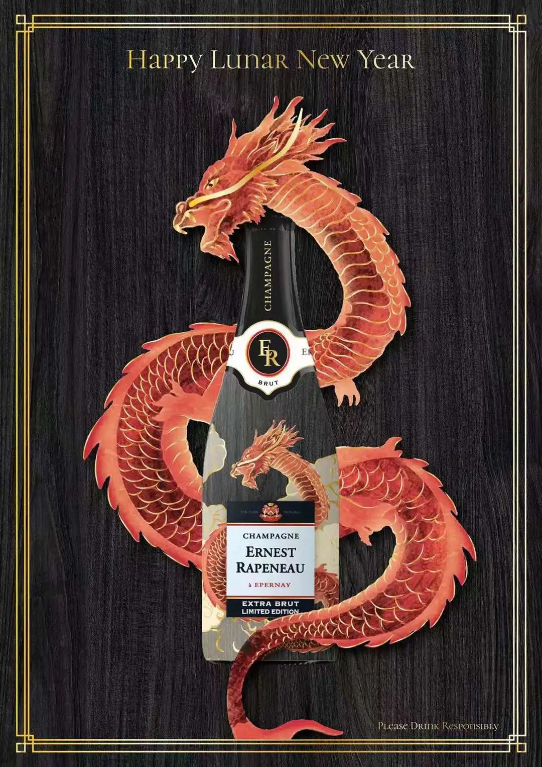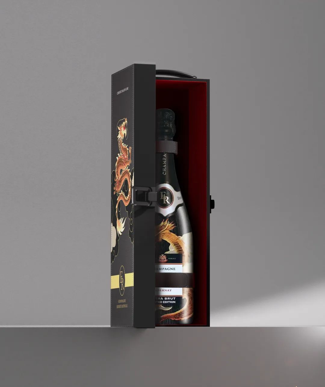 ER奈斯香槟作为法国香槟镇DI 一大生产家族对中华文化也是格外偏爱,每年的生肖纪念版从未缺席。外观非常有辨识度的金龙矫捷游动,栩栩如生。而口感上,ER龙年限定香槟在调配时(blending)额外加入了5年窖藏酒液,风味更为复杂悠长,回味不尽。