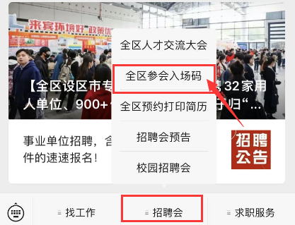 在【广西人才网】公众号底部的【招聘会】菜单栏中找到【全区参会入场码】子菜单即可免费领取。