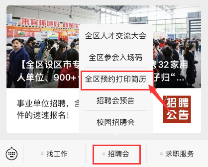 在广西人才网公众号底部的【招聘会】菜单栏中找到【全区预约打印简历】子菜单,即可预约打印简历。