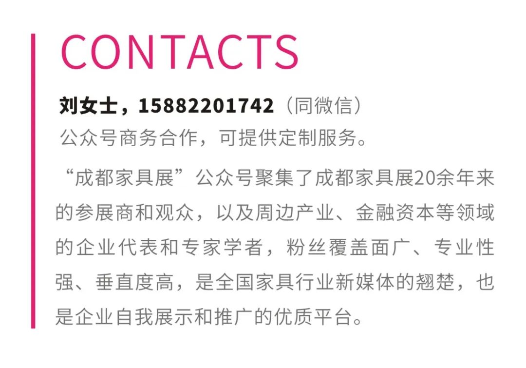 这一系列战略合作将有力推动成都家具展持续整合国内行业资源,构建新型展贸平台,促进展产互促式发展,共同打造“全品类家具展”服务平台,全方位展示全国家居全链条,融合多元产业,赋能产业实体,聚集展会平台、行业商协会、产业园区和家居卖场等多重优势,为全国家具品牌和经销商提供展务、商务和会务的“三务一体”高质量服务,积极构建“中国平台、全球共享”的产业平台。